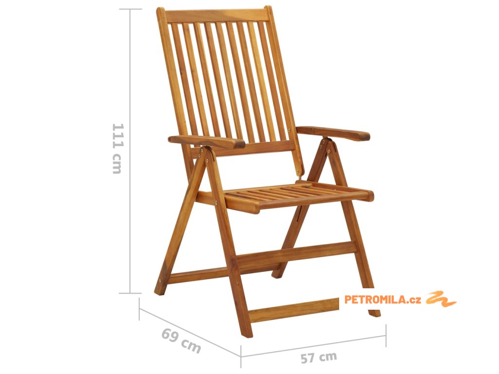 Skládací židle je vyrobená z masivní akácie, tropického tvrdého dřeva, takže je stabilní a odolná. Povrch je napuštěný olejem, a snadno se proto čistí vlhkým hadříkem. Jídelní židle se dá polohovat do 5 pozic, poskytne vám tedy při sezení optimální pohodlí. Když ji zrovna nepoužíváte, můžete židli složit, abyste ušetřili místo. O komfort se vám postarají dodané podušky.