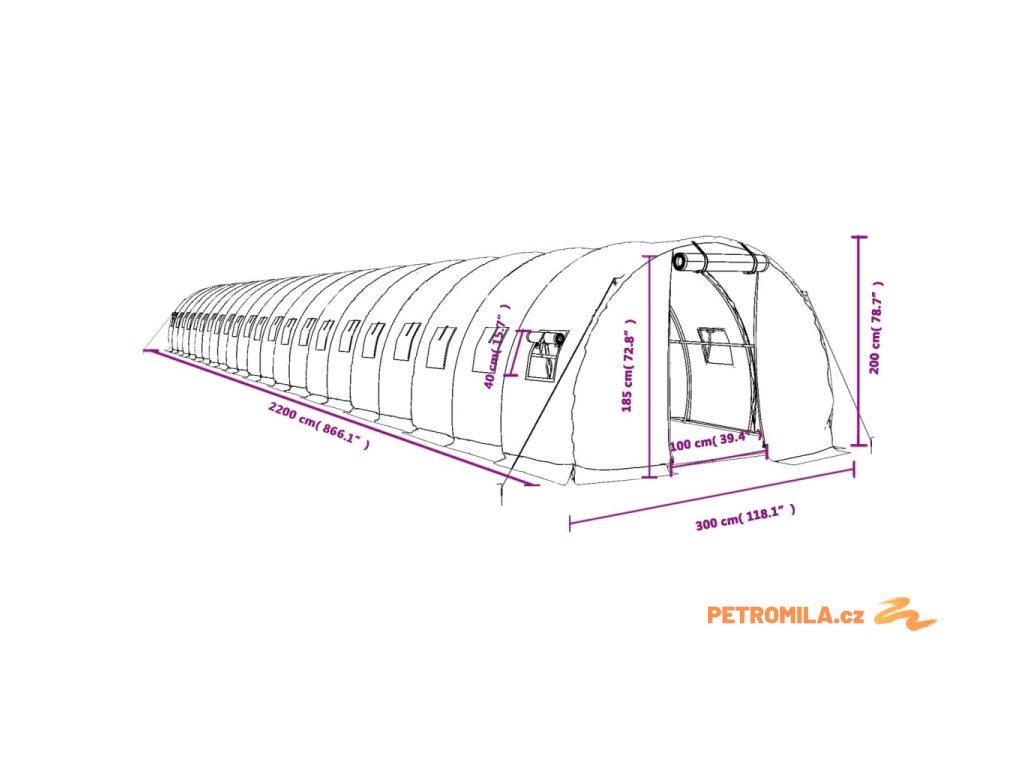 Skleník s ocelovým rámem bílý 66 m² 22 x 3 x 2 m