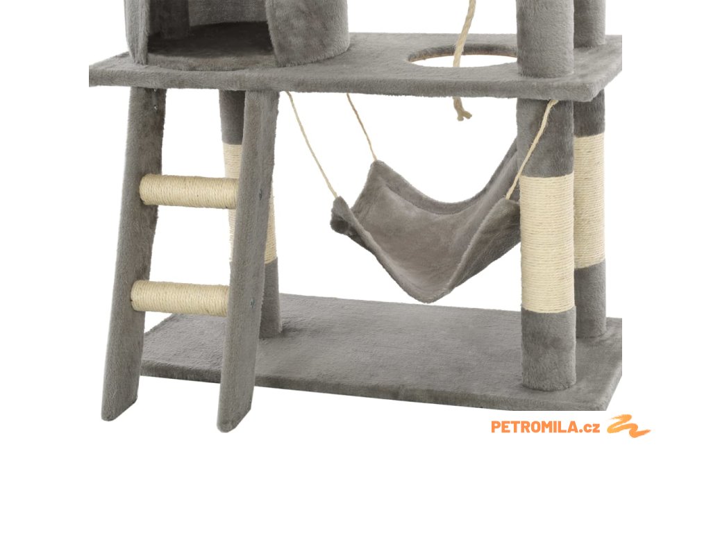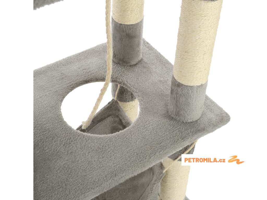 Škrabací sloupky s plyšovým potahem jsou omotány sisalovým provazem, což je pro vaše kočkovité kamarády velice pohodlné a praktické pro ostření jejich drápků. Vaše kočky si na této hračce užijí spoustu zábavy, až se budou navzájem honit a skákat nahoru a dolů. Náš kočičí strom disponuje také útulným domečkem, kde si vaše kočka může odpočinout nebo se prospat. Je navíc vybaven houpací sítí, žebříkem, lanem na šplhání, plošinami k pozorování a místy k odpočinku, takže se váš malý kamarád nebude nikdy nudit. Základna tohoto škrabadla pro kočky je pevná a stabilní.