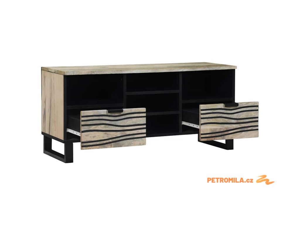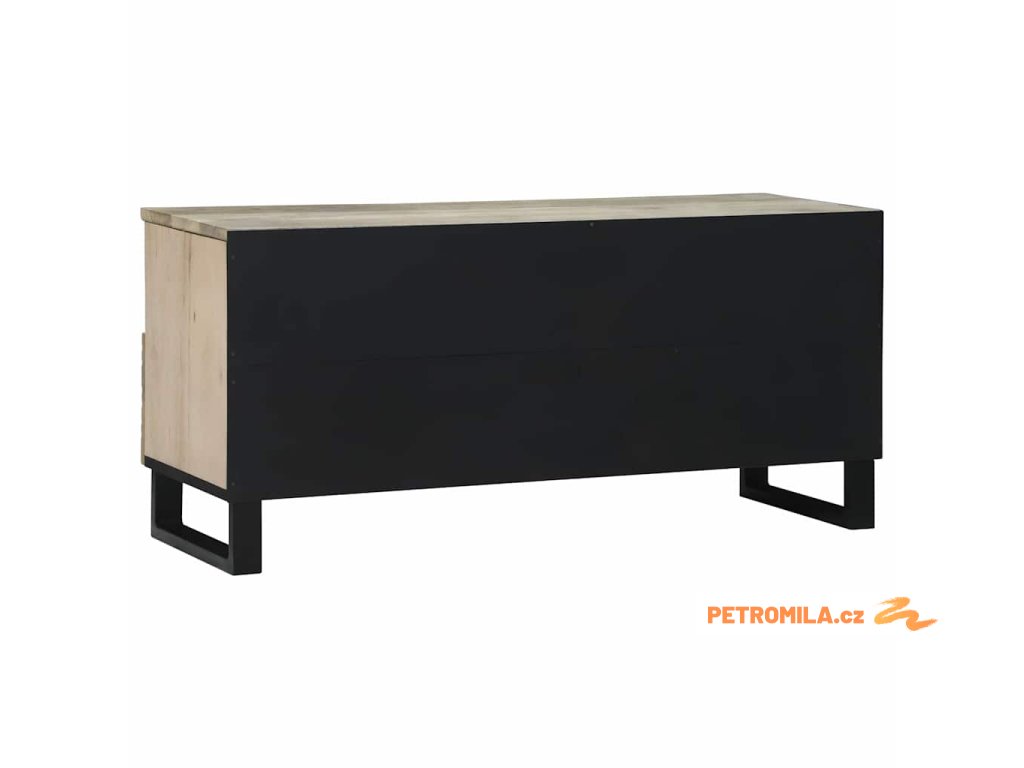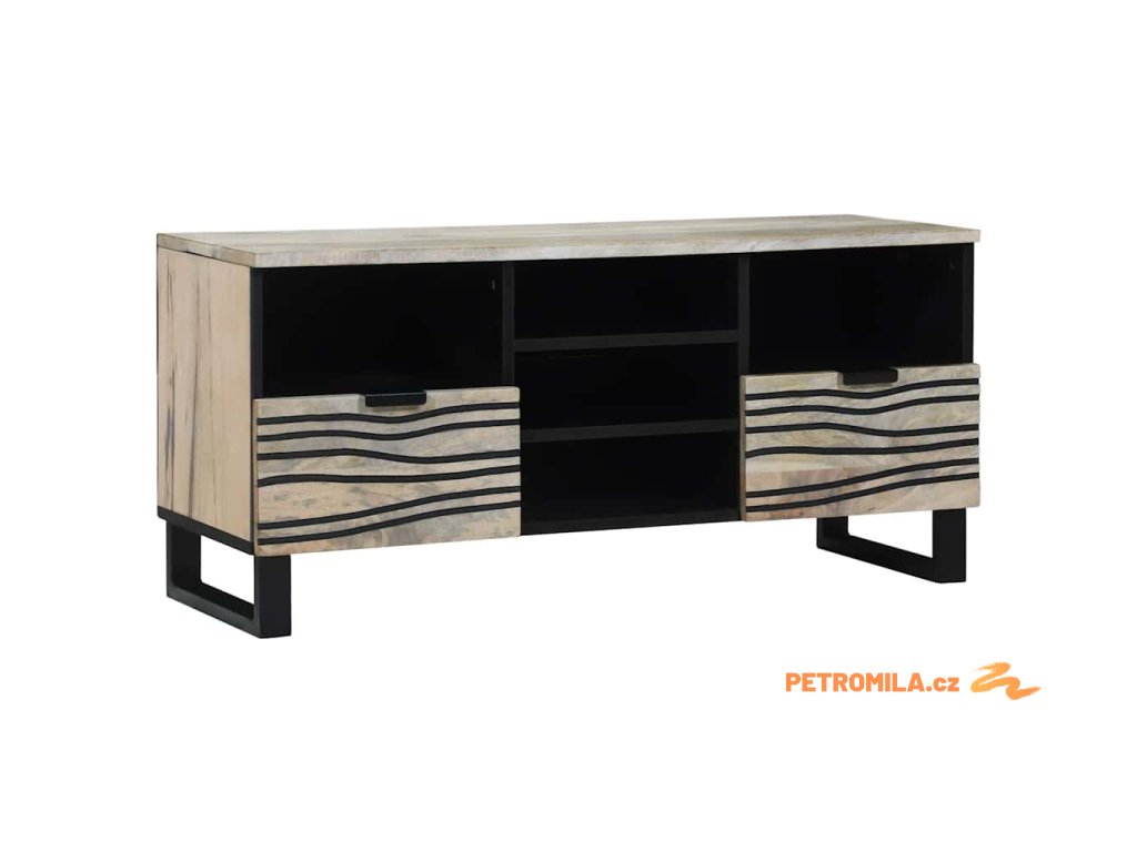 - Výrazný design: Černé železné nohy a vlnitá textura dělají z této skříně skvělou volbu pro rustikální styl. S výškou 46 cm sedí akorát pro moderní ploché televize.