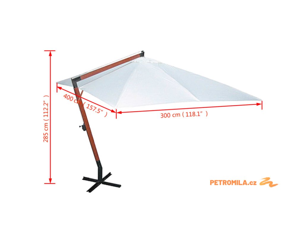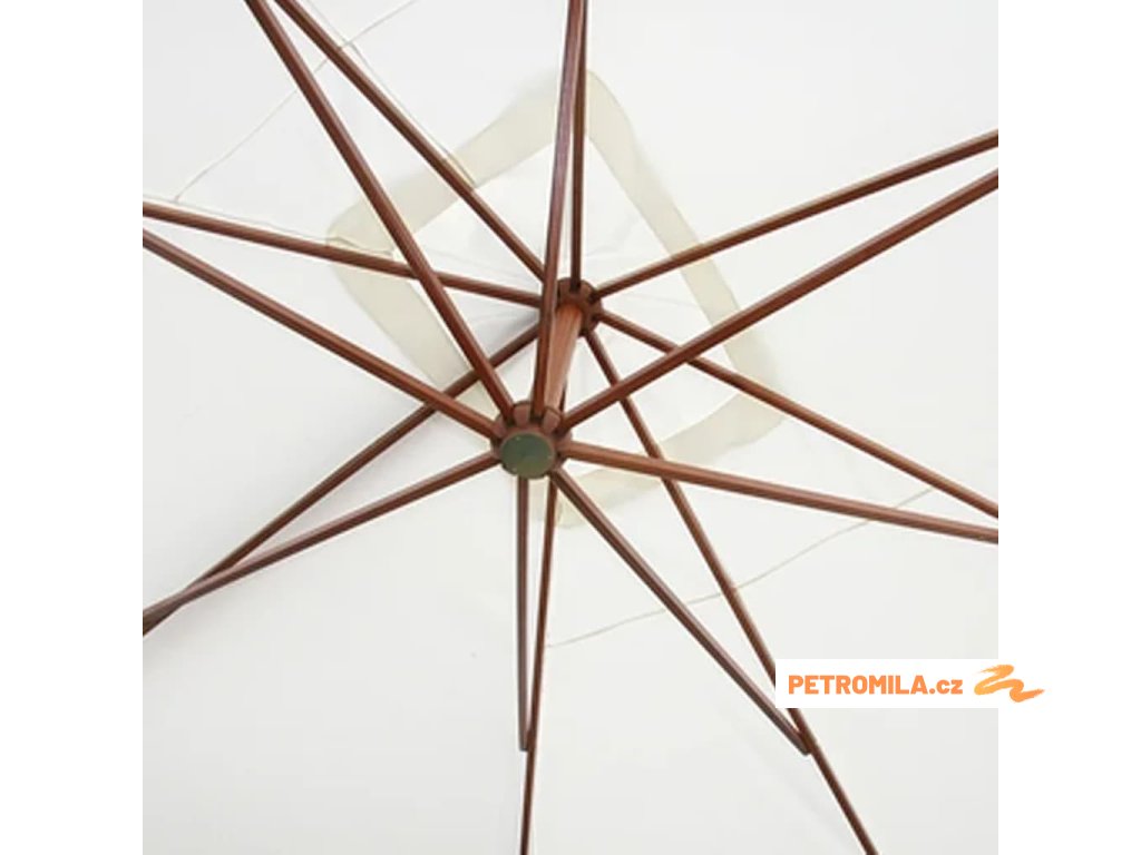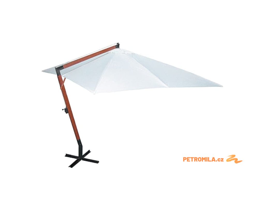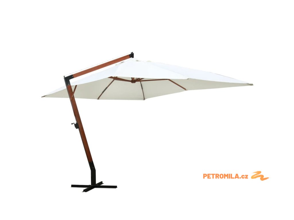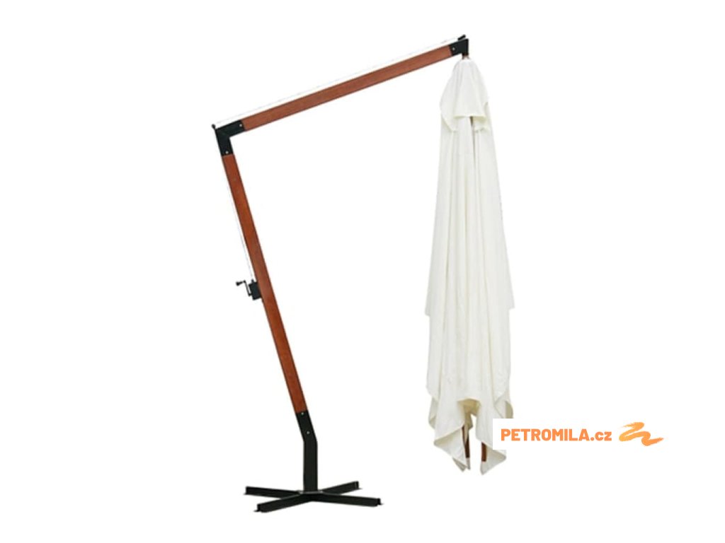 Krásný velký závěsný slunečník s dřevěným podstavcem.