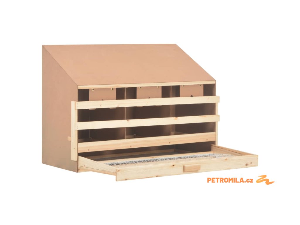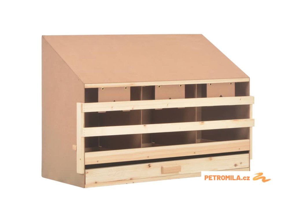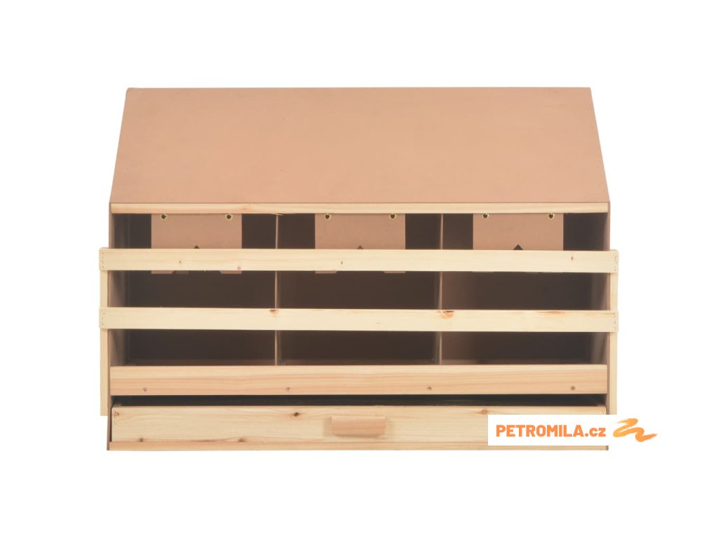 Tři prostorné boxy jsou určené pro 3 velké slepice, které se zde mohou pohodlně uvelebit a snášet vejce. Vejce šetrně padají skrz otvory v podlaze do spodní zásuvky, což usnadňuje jejich sbírání. Vysouvací dno umožňuje jednoduché čištění. Hřady lze složit, abyste zabránili nočnímu hnízdění. Šikmá střecha slepicím znesnadňuje přizvednout se ve snáškovém hnízdě a kontaminovat vejce. V našem obchodě najdete rovněž snášková hnízda s plochou střechou.