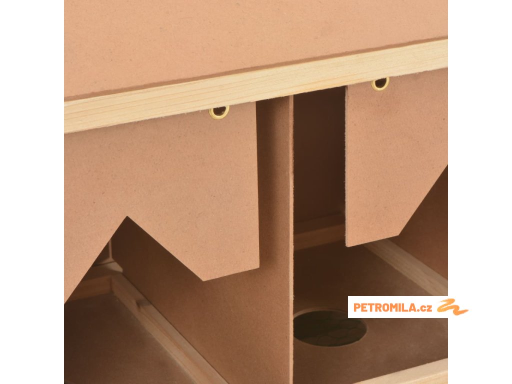 Snáškové hnízdo pro drůbež je zhotovené z masivního borového dřeva a překližky, takže je ideální dlouhodobé používání. Sestavení snáškových boxů je snadné.