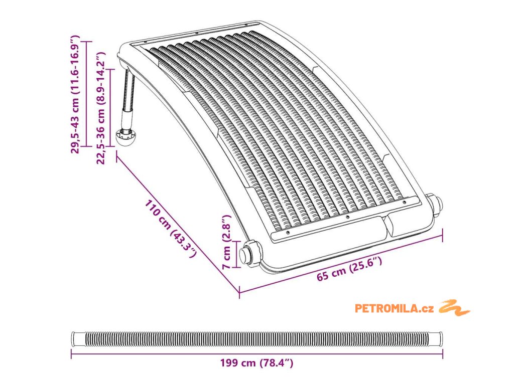 Tento solární ohřevný systém je vyrobený z vysoce kvalitních materiálů, které výborně vzdorují častému vystavení slunci a povětrnostním podmínkám. Zakřivené panely pro ohřev bazénu a nastavitelné nohy zajišťují maximální plochu pro zachycení sluneční energie, což také znamená vyšší účinnost ohřevu.