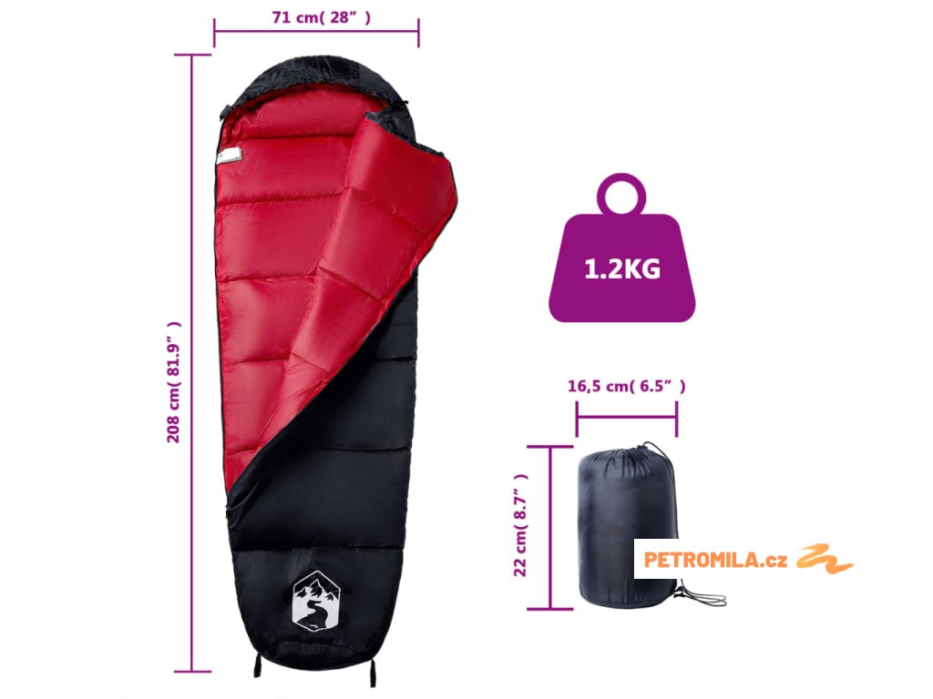 - Rozměry spacího pytle: 208 x 71 cm (D x Š)