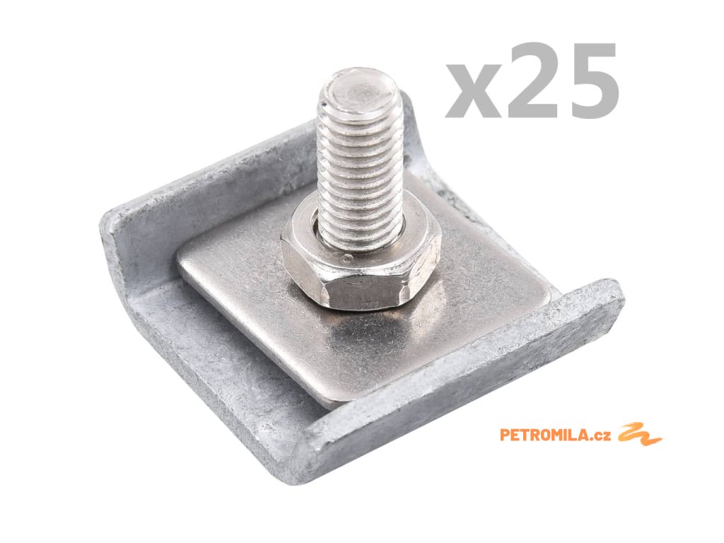 Balení obsahuje 25 setů v jednom balení. Každá sada se skládá z 1 čelní destičky, 1 zadní destičky, 1 šroubu a 1 matice.