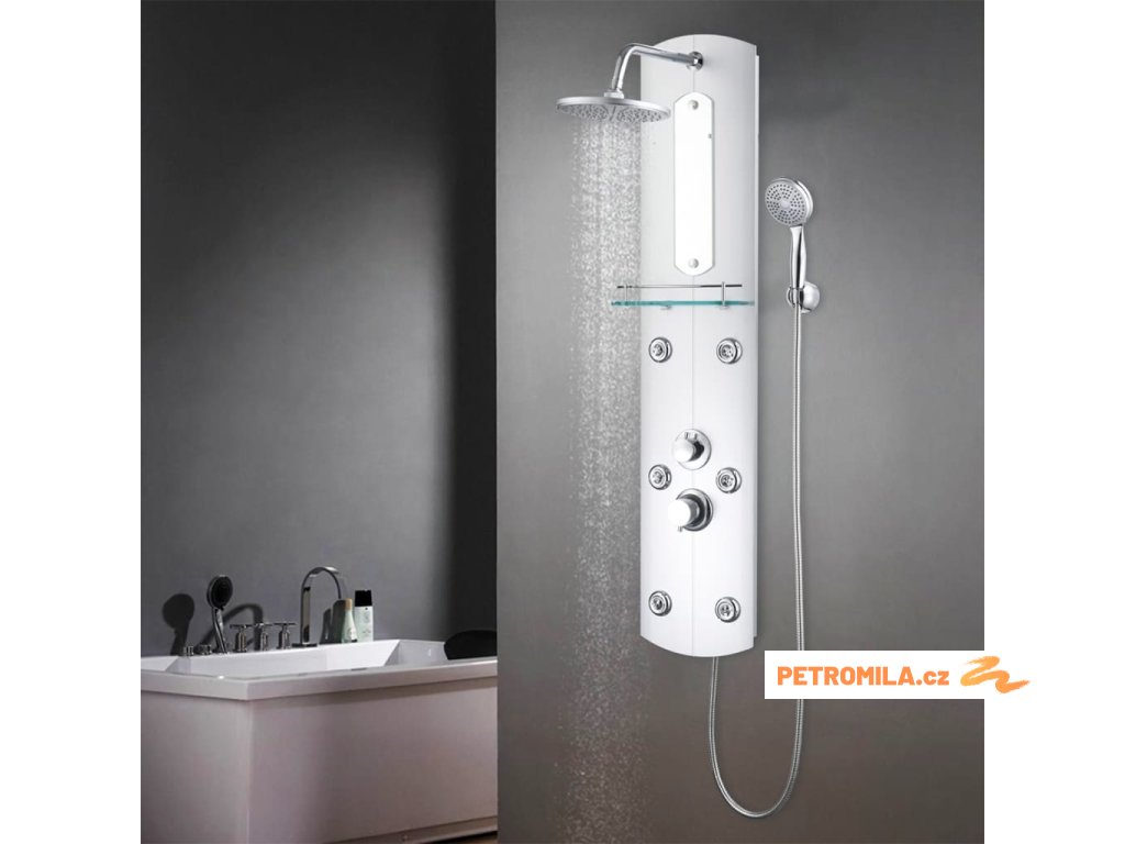 Hlavní část sprchového panelu je vyrobena z umělé hmoty, díky čemuž je lehká a dá se snadno přesouvat. Panel nabízí tři režimy sprchování: déšť, hydromasážní trysky a ruční sprchu, mezi nimiž se dá snadno přepínat. Na sprchovém panelu se rovněž nachází malé zrcadlo. Je tam také skleněná polička, kam si můžete položit potřeby ke sprchování. Silikonové trysky jsou odolné vůči usazování vodního kamene. Dopřejte si tu pravou relaxaci při každém sprchování a potěšte se krásou moderního stylu tohoto sprchového panelu! Montáž je snadná.