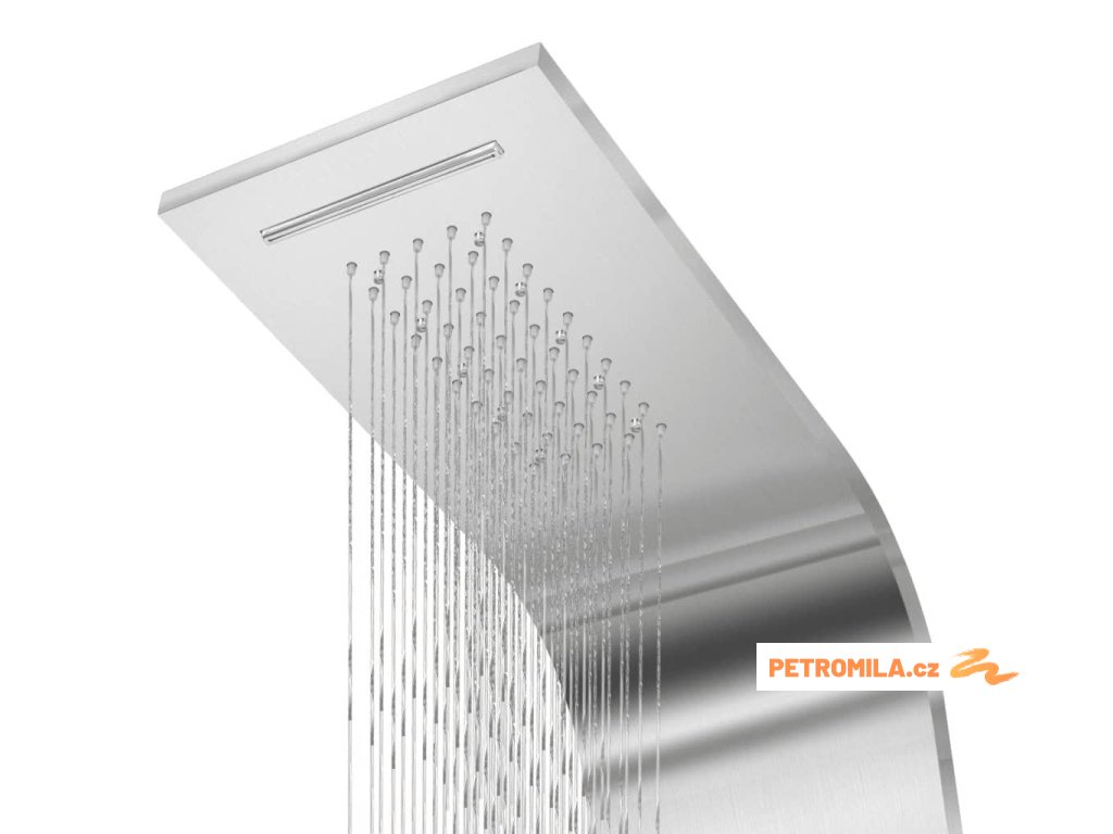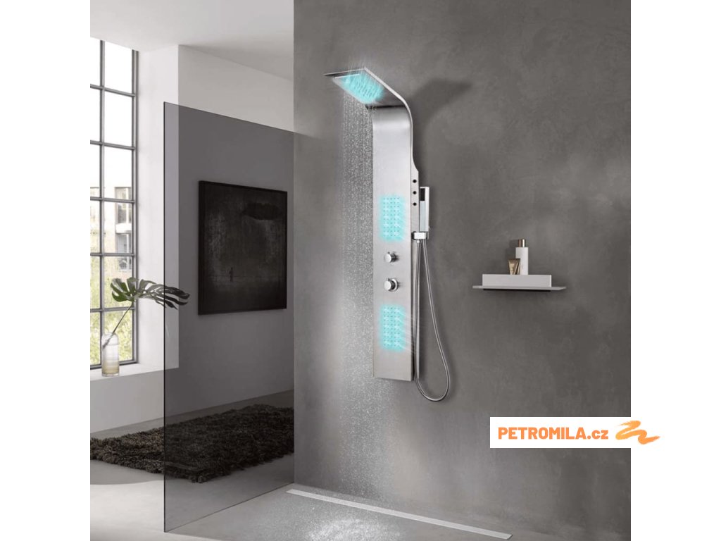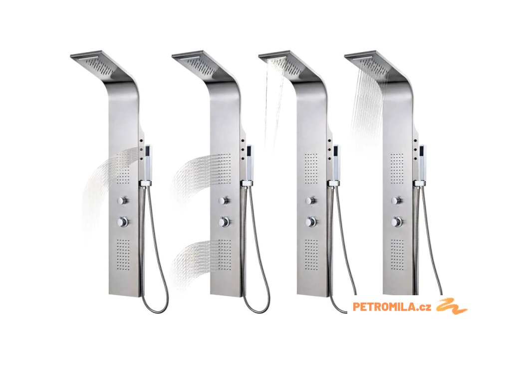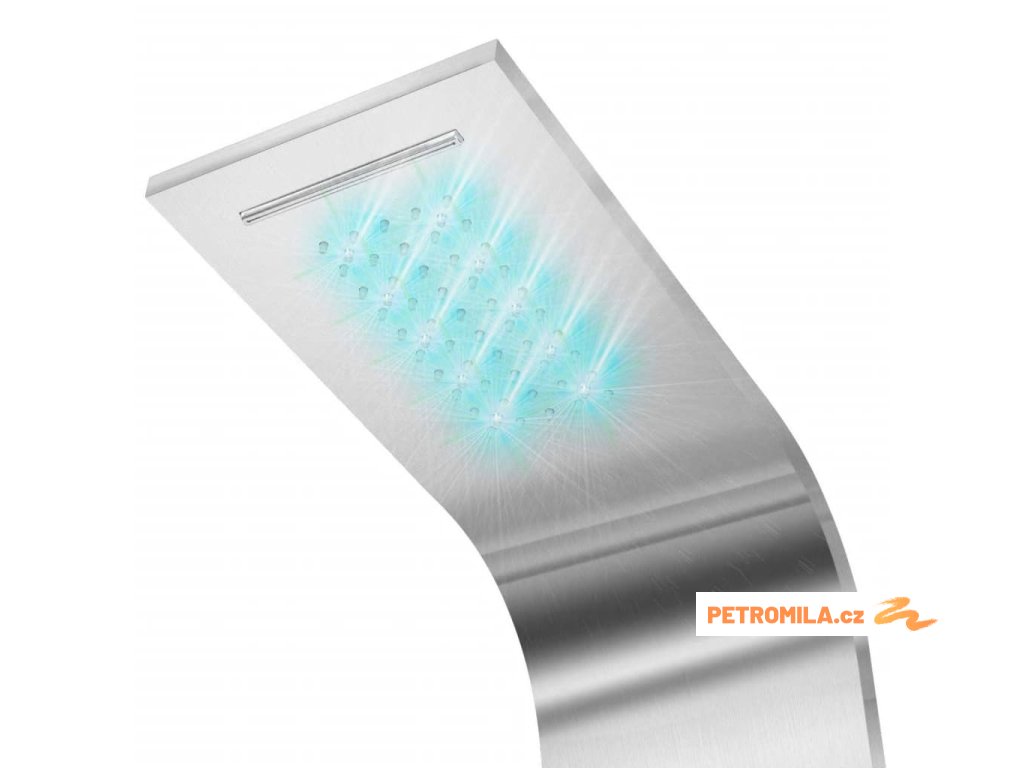 Sprchový panel je vyrobený z odolné nerezové oceli s kartáčovaným povrchem a má krásný zaoblený design. Má čtyři funkce: tropický déšť, vodopád, hydromasážní trysky a ruční sprcha, které lze snadno ovládat prostřednictvím přepínacího regulátoru. LED světla si můžete zapnout či vypnout dle vaší momentální nálady. Teplota vody se reguluje pomocí knoflíku termostatu.