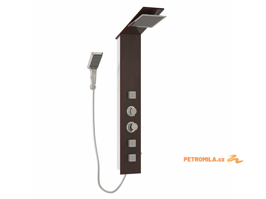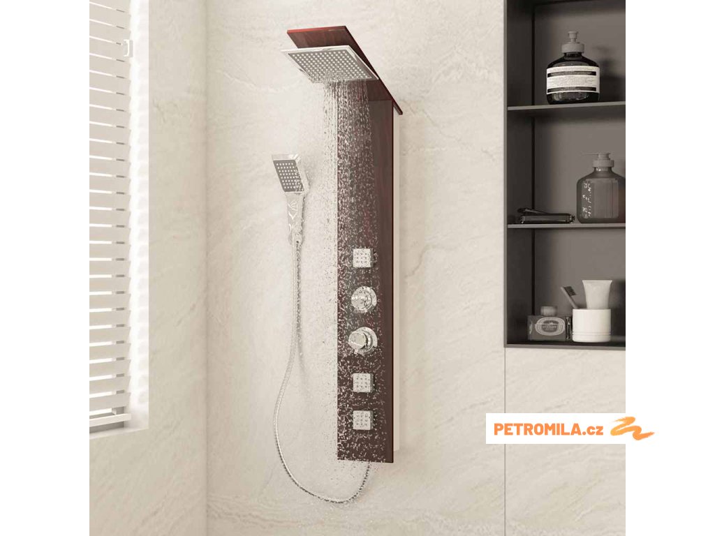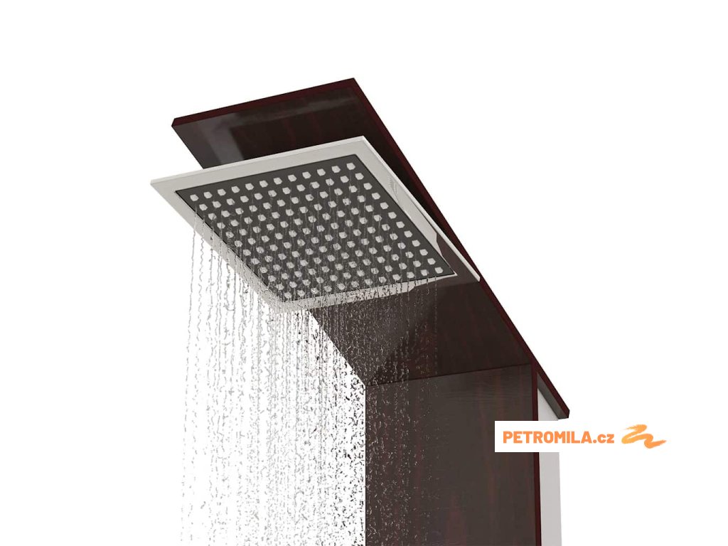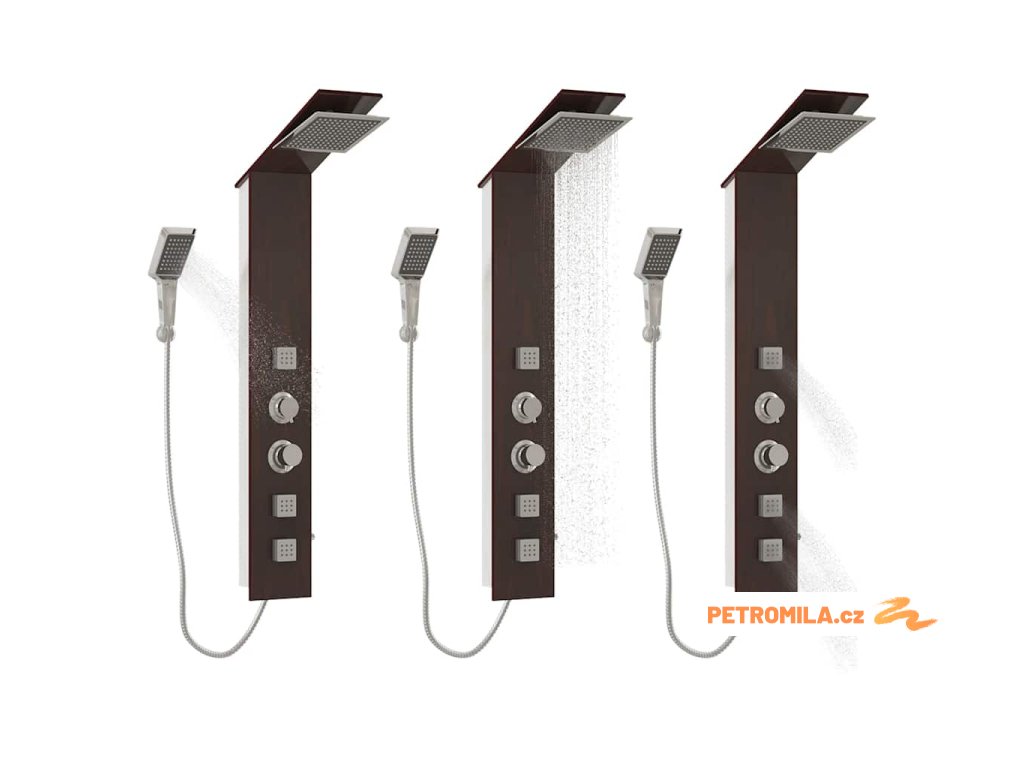 Sprchový panel je vyrobený z velmi kvalitního skla s krásným potiskem imitujícím kresbu dřeva.Má tři funkce: tropický déšť, hydromasážní trysky a ruční sprcha, které se snadno ovládají pomocí otočného přepínače.