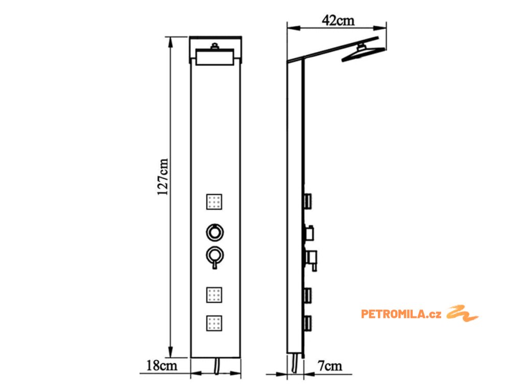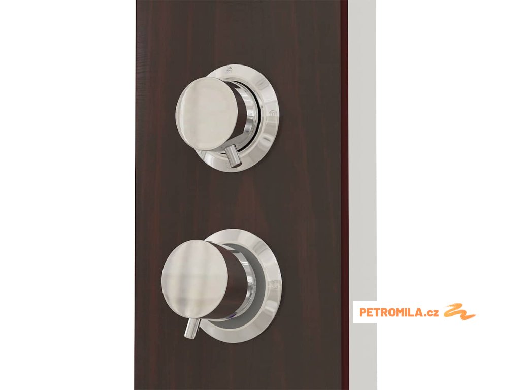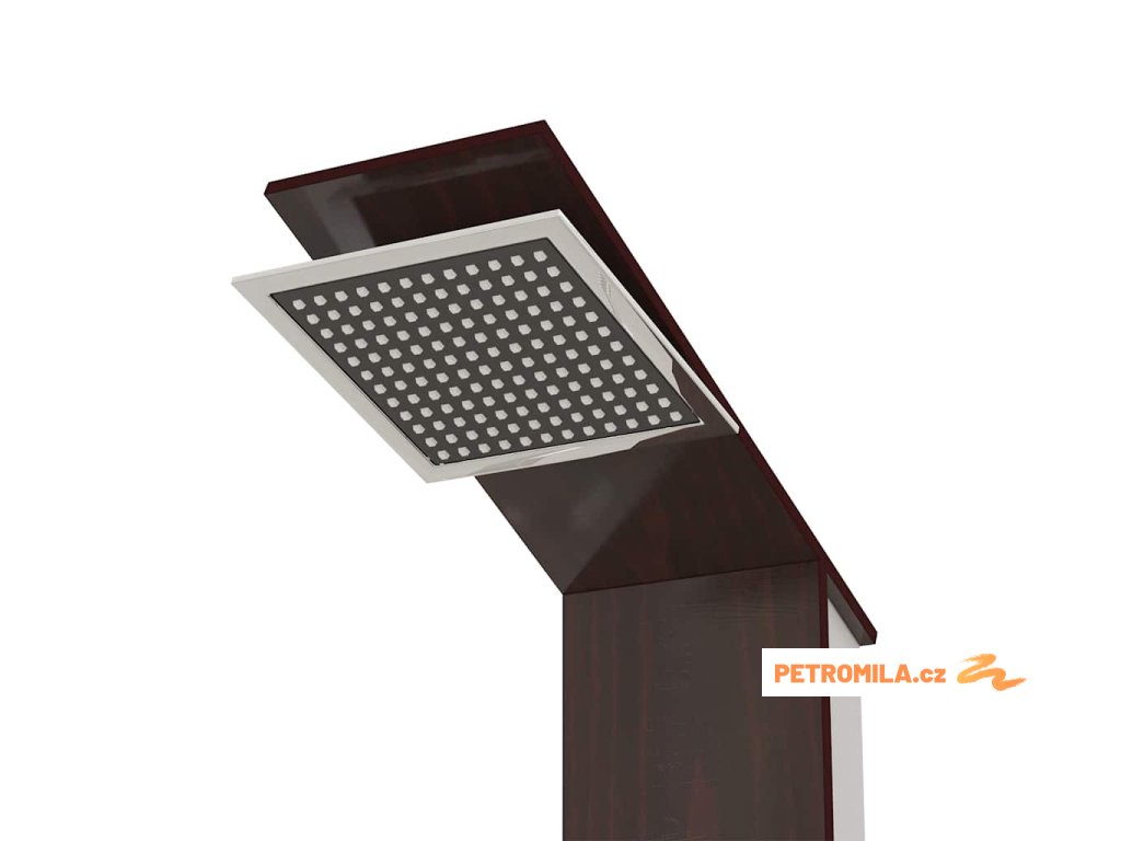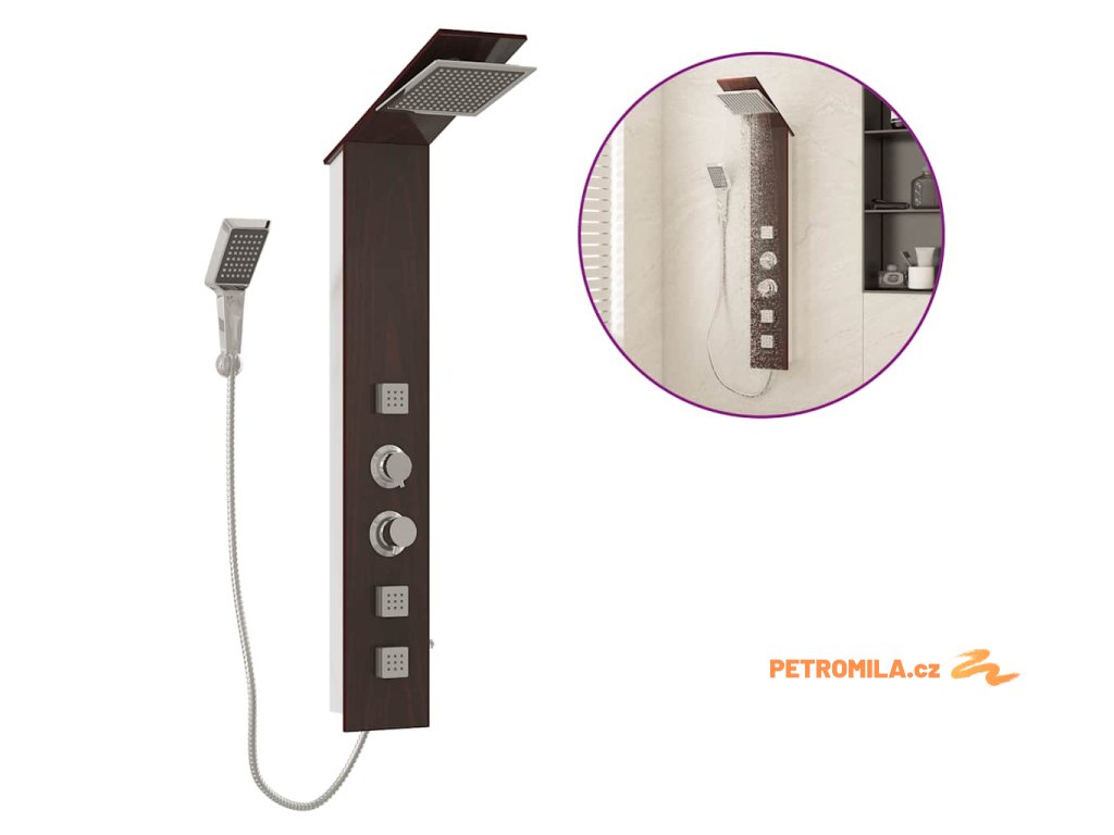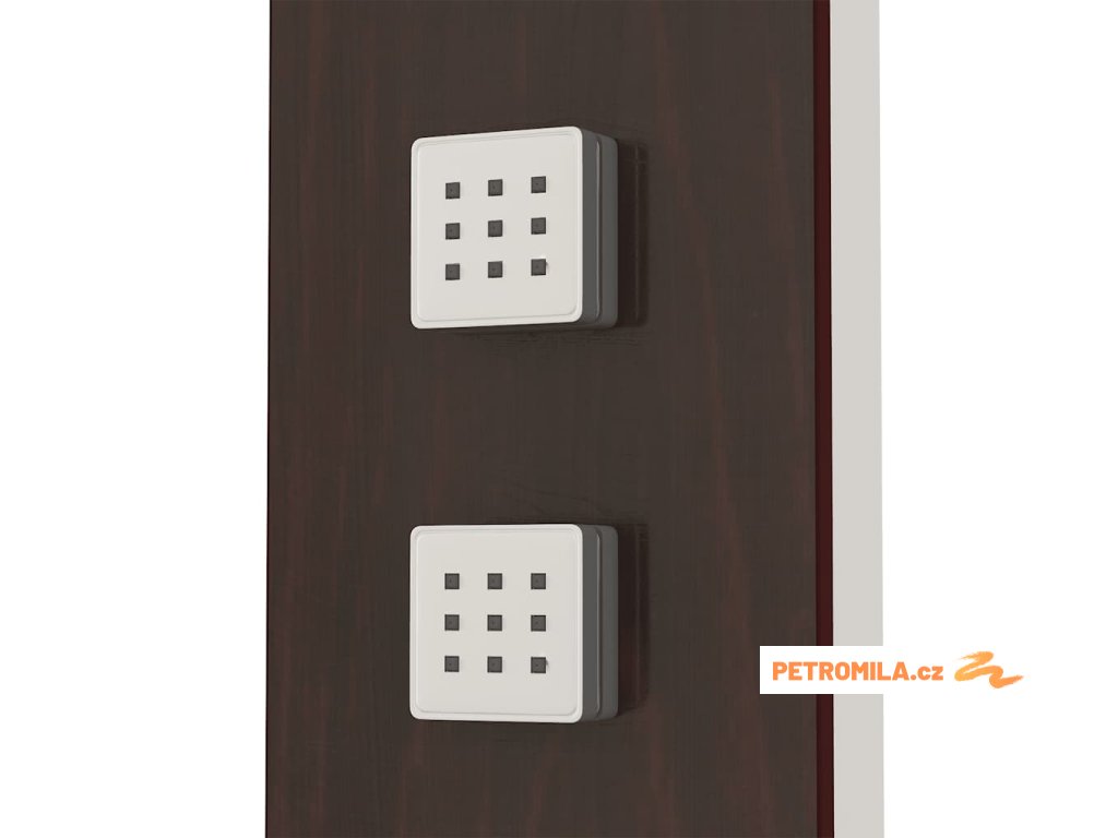 Sprchový panel je vyrobený z velmi kvalitního skla s krásným potiskem imitujícím kresbu dřeva.Má tři funkce: tropický déšť, hydromasážní trysky a ruční sprcha, které se snadno ovládají pomocí otočného přepínače.