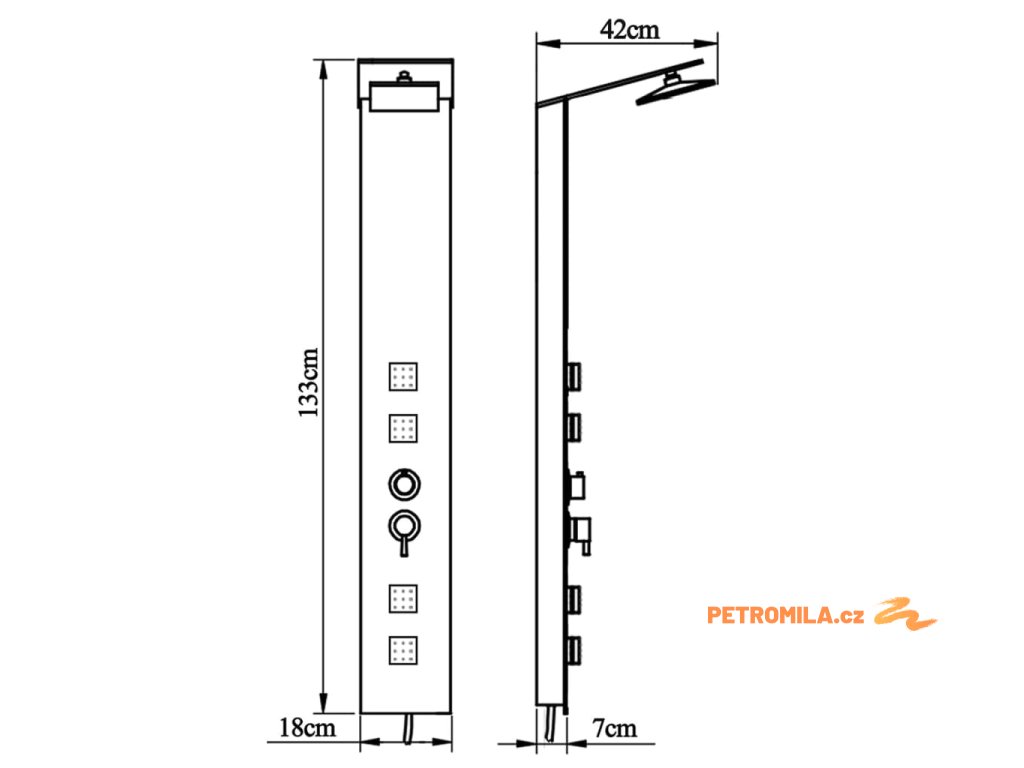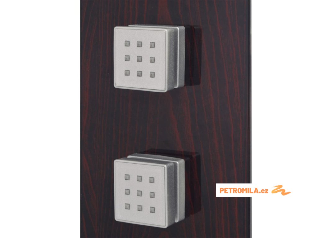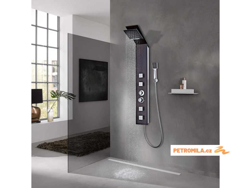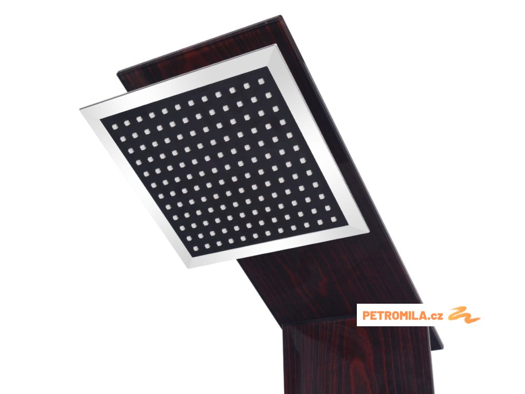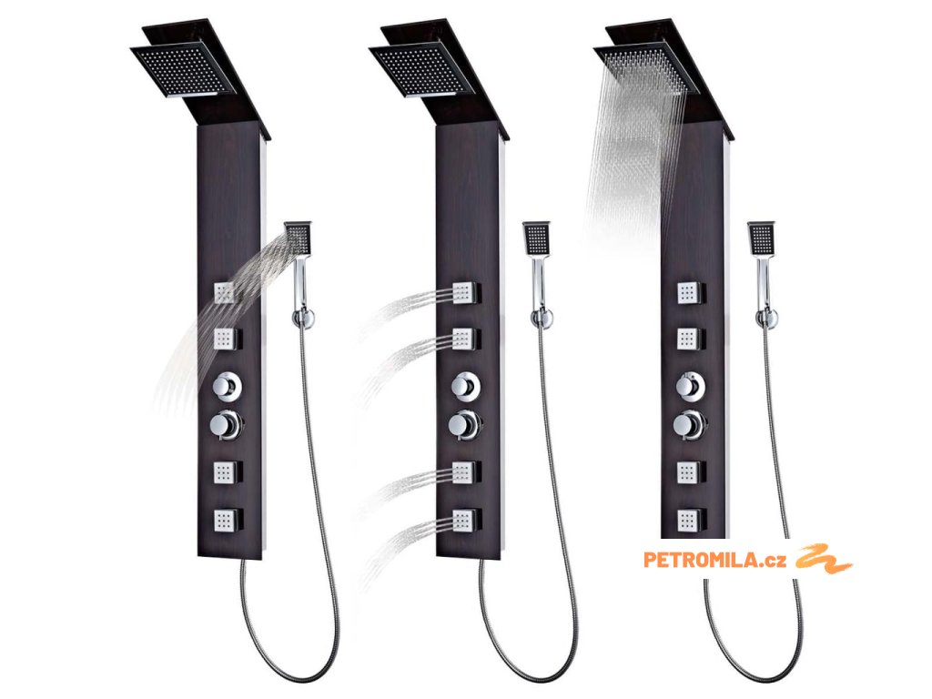 Sprchový panel je vyrobený z velmi kvalitního skla s krásným potiskem imitujícím kresbu dřeva.Má tři funkce: tropický déšť, hydromasážní trysky a ruční sprcha, které se snadno ovládají pomocí otočného přepínače.