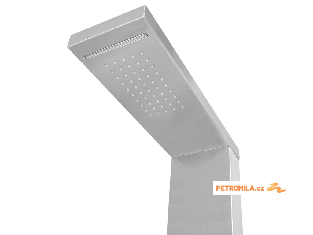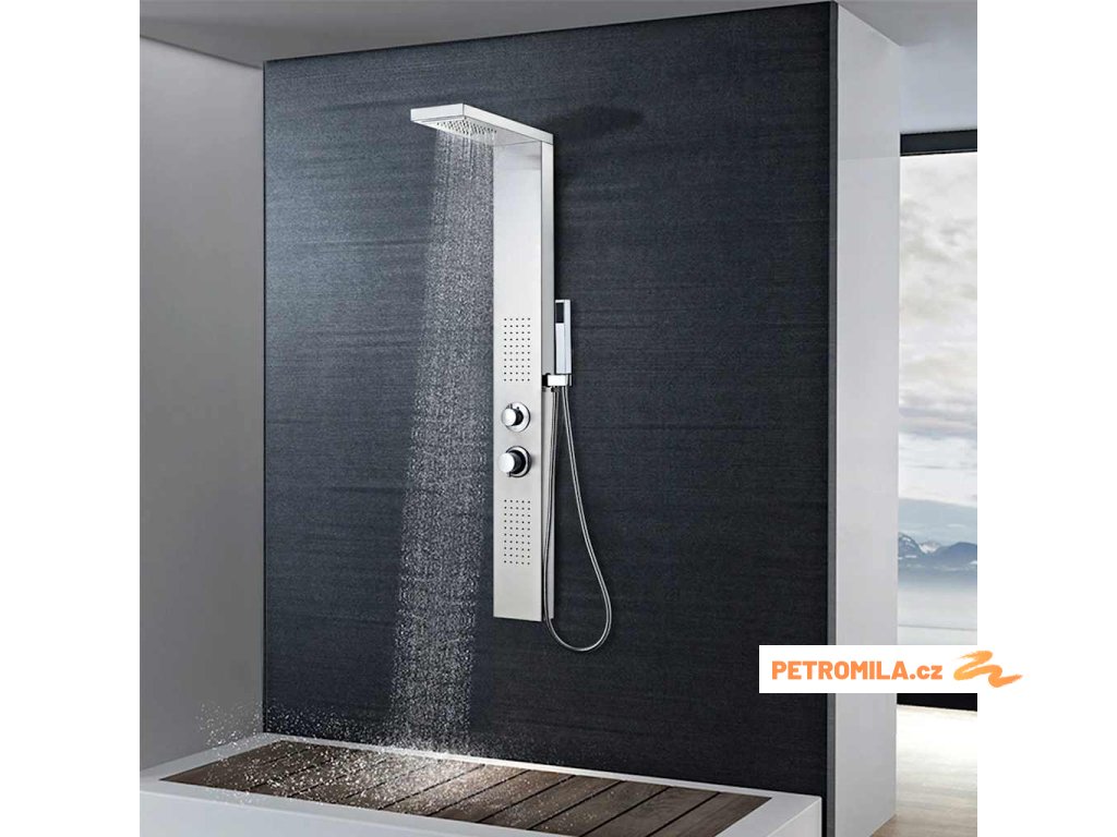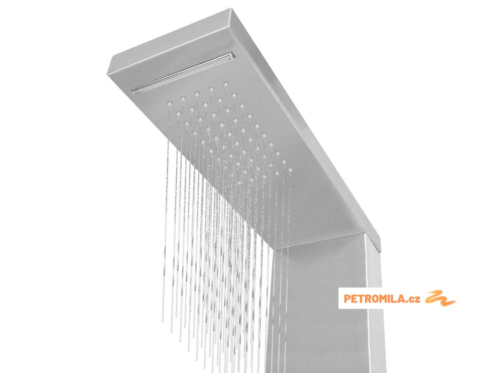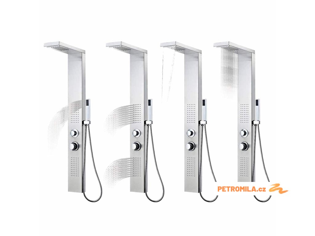 Sprchový panel je vyrobený z velmi odolné oceli s kartáčovaným povrchem a má krásný čtvercový design. Má čtyři funkce: tropický déšť, vodopád, hydromasážní trysky a ruční sprcha, které se snadno ovládají pomocí knoflíkového přepínače.