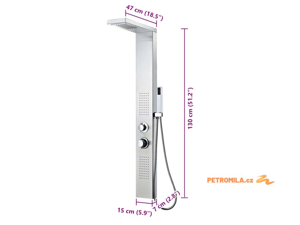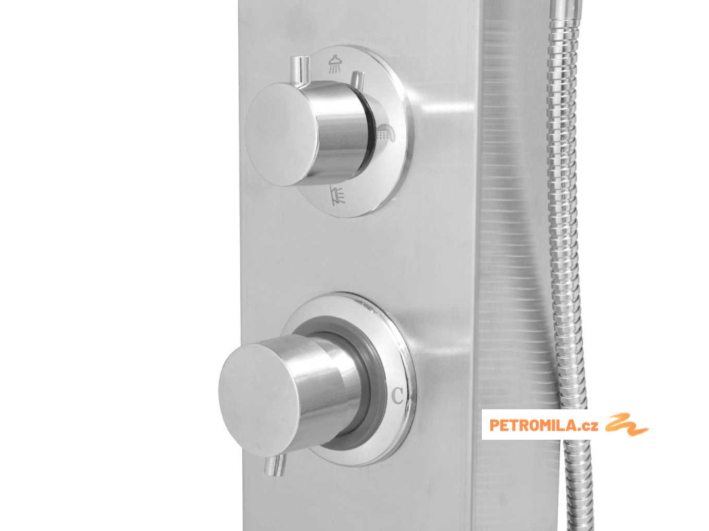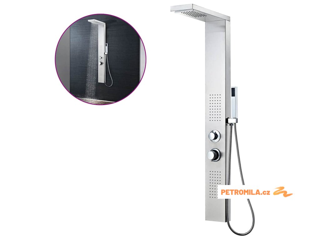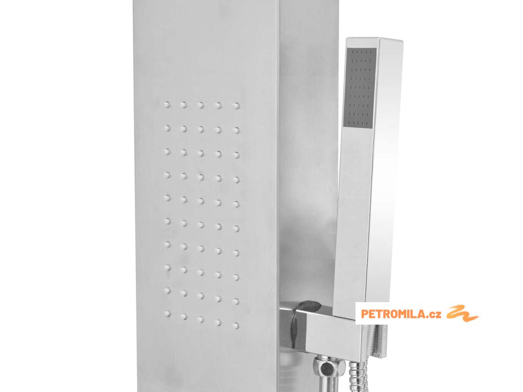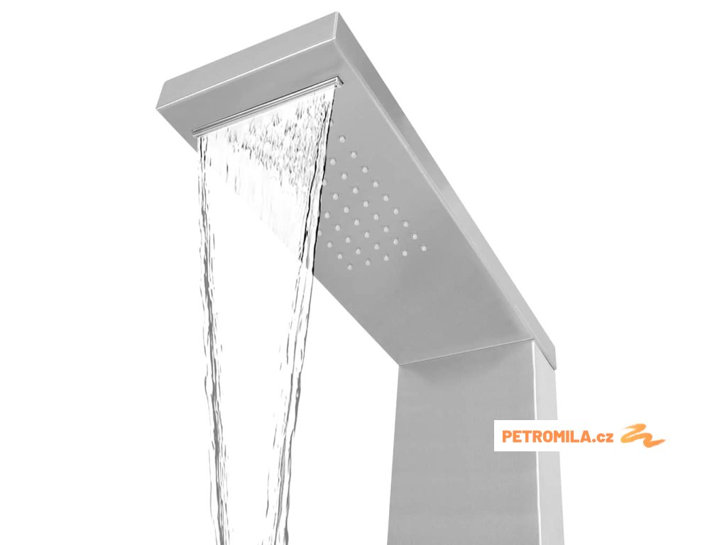 Sprchový panel je vyrobený z velmi odolné oceli s kartáčovaným povrchem a má krásný čtvercový design. Má čtyři funkce: tropický déšť, vodopád, hydromasážní trysky a ruční sprcha, které se snadno ovládají pomocí knoflíkového přepínače.