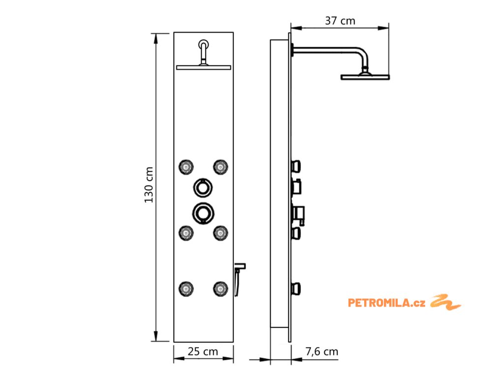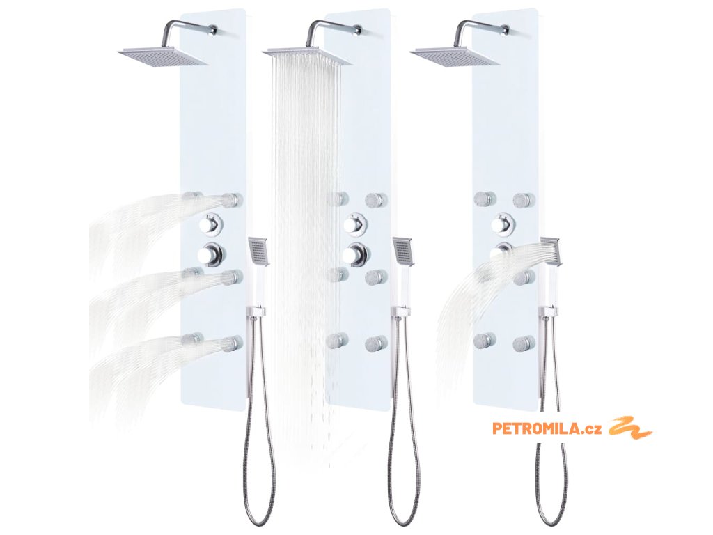Sprchový panel je vyroben z nerezové oceli a tvrzeného skla. Tvrzené sklo se vyrábí řízeným tepelným nebo chemickým zpracováním, je tedy mnohem odolnější a bezpečnější než běžné sklo. Panel nabízí tři funkce způsobu sprchování: tropický déšť, hydromasážní trysky a ruční sprchu, mezi nimiž se dá snadno přepínat. Silikonové trysky jsou odolné vůči usazování vodního kamene. Dopřejte si tu pravou relaxaci při každém sprchování a potěšte se krásou moderního stylu tohoto sprchového panelu! Montáž je snadná.