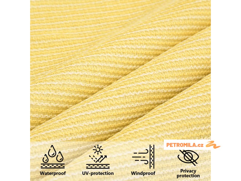 Sluneční plachta vyrobená ze 100% HDPE (vysokohustotní polyethylen) vás chrání před přímým slunečním zářením, umožňuje dostatečný průchod vzduchu a je propustná pro vodu. HDPE je speciálně upraven, takže je odolný proti plísním a UV záření. Slunečník se snadno sestavuje pomocí nerezových upevňovacích prvků na každém rohu a přiložených lanek.