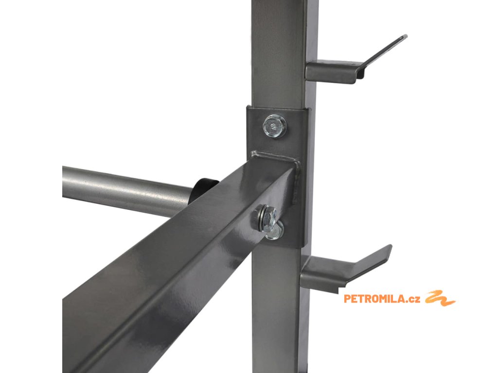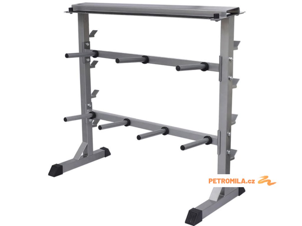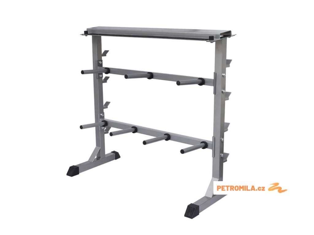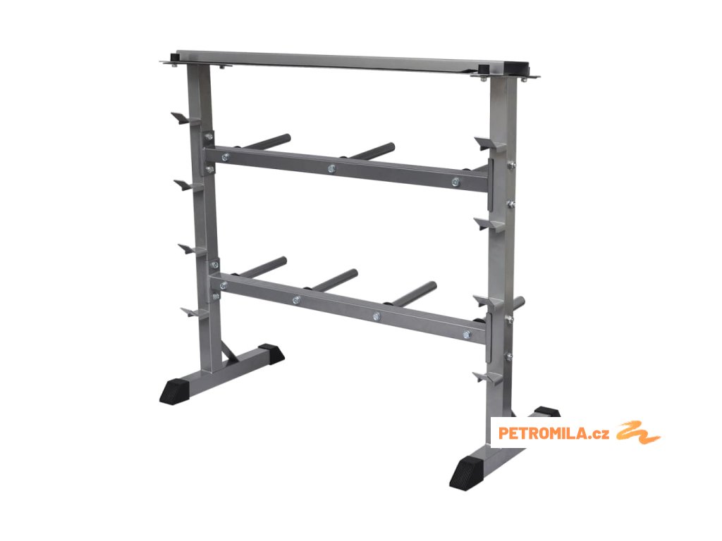Tento stojan pro činky a závaží je navržen tak , aby udržel činky , závaží a tyče organyzované a nikoli na podlahy . Vychází vstříc většině velikostí a stylů činek , včetně neoprenu a litiny . Stabilní rám se dvěma policemi vám pomůže udržet čistší domácí posilovnu tím , že vám poskytne místo kde zaparkovat činky , když nejsou v použití . Je vyroben z odolné oceli pro roky používání . Protiskluzová gumová základna pomáhá chránit podlahu před poškozením a zajišťuje stabilitu a optimální bezpečnost . Tento stojan s jeho robustní konstrukci má nosnost 300 kg . Je vhodný pro téměř všechny délky tyče . Měří 49x100x95 cm kompletně poskládaný .
