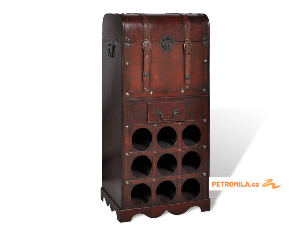 Toto je dokonalý stojan na víno pro milovníky vína. Tento elegantní stojan na víno, vhodný ke skladování většího počtu lahví, bude výrazným kusem nábytku ve vaší kuchyni, jídelně, obývacím pokoji apod. Tento stojan na víno s místem na 9 lahví, úložnou truhlou a zásuvkou na doplňky pojme vše nezbytné pro přípravu a vychutnání si sklenice vína.