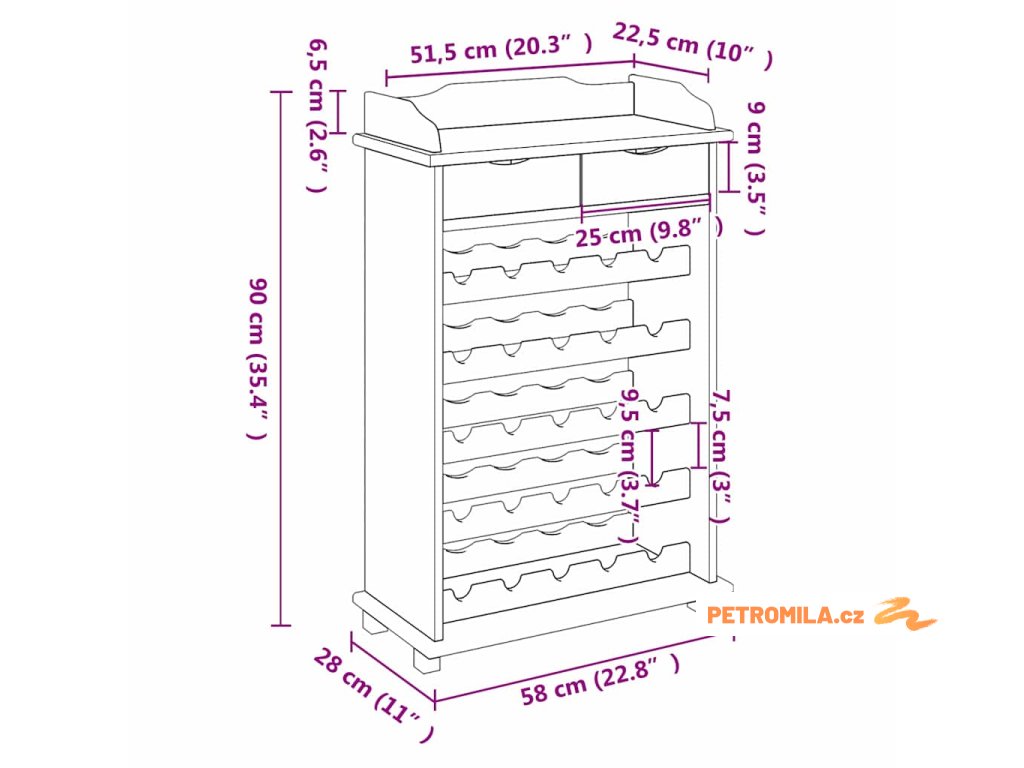 - Vlastnosti / Funkce / Design: Rustikální design ukazuje přírodní krásu, spojuje funkčnost s nadčasovým stylem. Je robustní a přináší teplý, přívětivý pocit do tvé kuchyně. Regál pojme různé velikosti lahví a zlepšuje vystavení tvých vín. Promyšlený design usnadňuje používání a zároveň zkrášluje jakýkoliv prostor.