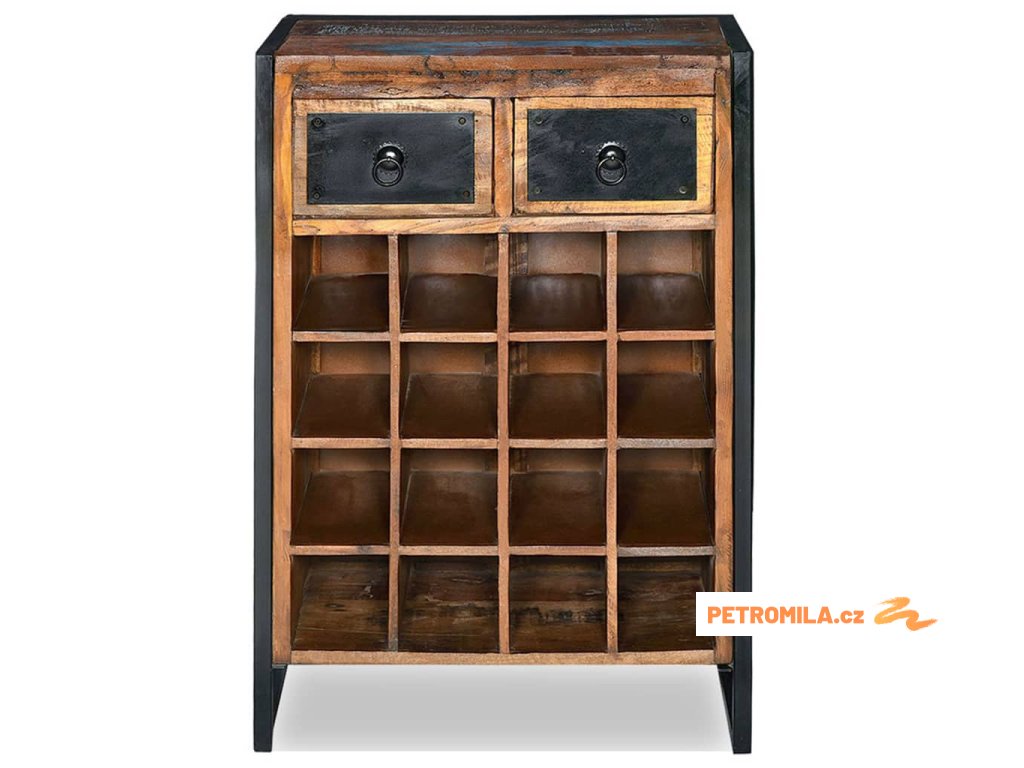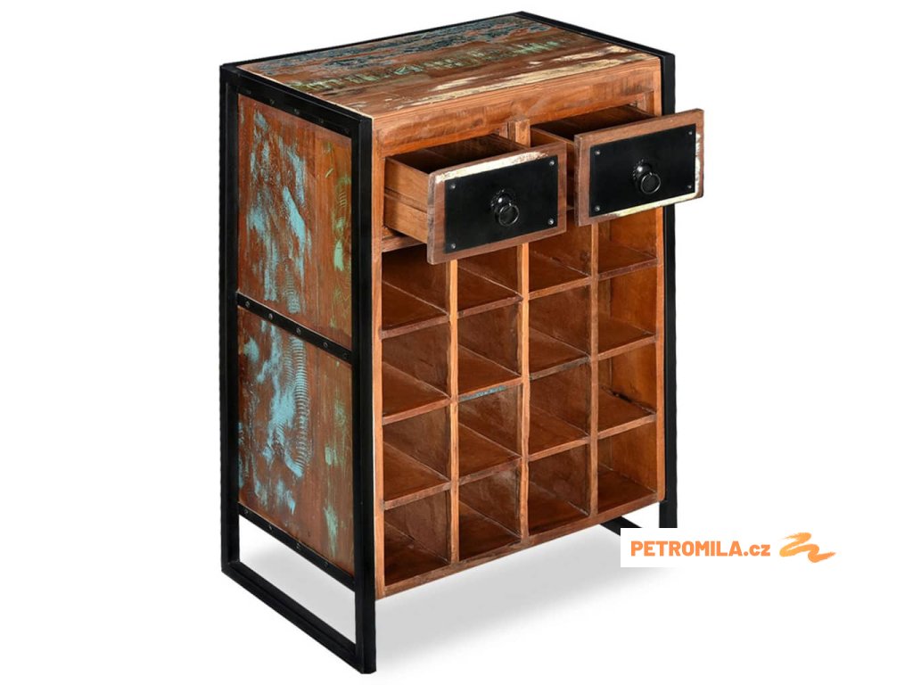 Dřevěný stojan na víno je zhotovený v industriálním stylu a je perfektní pro milovníky vína. Je okouzlující a do vaší kuchyně, jídelny či obývacího pokoje přinese starosvětský šarm. Pojme až 16 lahví a má 2 šikovné zásuvky, kam si můžete ukládat nejrůznější doplňky. Tato domácí vinotéka vám nabídne vše potřebné, abyste si mohli vychutnat svou sklenku vína.