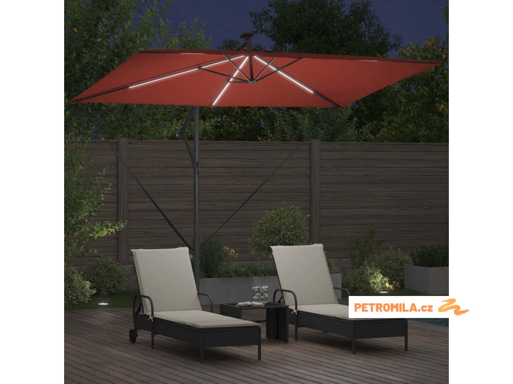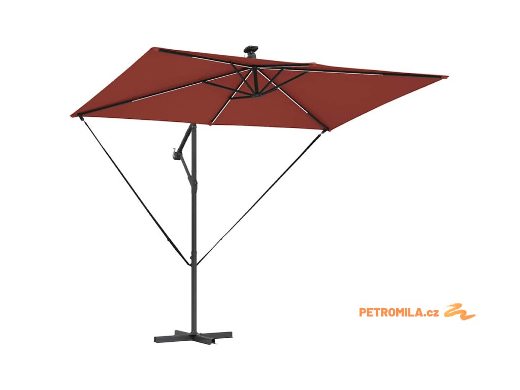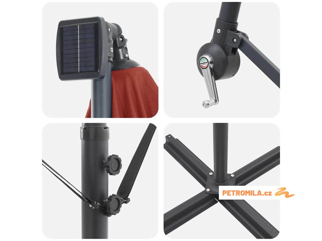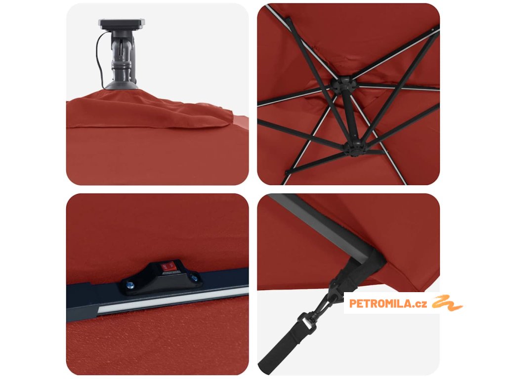 - Solární LED osvětlení: Navržen pro večerní zábavu, tento deštník zahrnuje jasné, ekologické LED osvětlení napájené solární energií. Ať už pořádáte zahradní večeři nebo noční povídání, útulná atmosféra, kterou vytváří, obohacuje jakýkoliv zážitek pod širým nebem během noci.