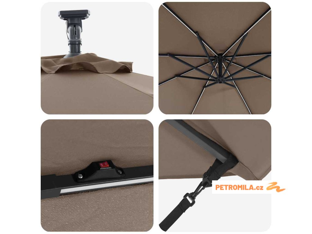 - -Friendly Solar Lighting Osvětli své večerní setkání integrovanými solárními LED světly umístěnými na každé žebro deštníku. Tyto energeticky úsporné světla nabízejí kouzelnou atmosféru, což ti umožňuje prodloužit si venkovní radovánky do noci s minimálním dopadem na životní prostředí.