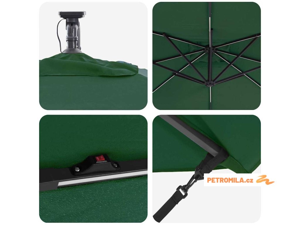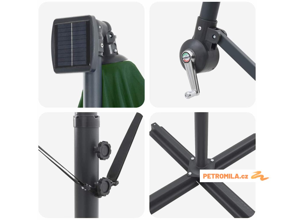 - Součásti: Obsahuje ruční kličku pro jednoduché otevírání a zavírání, naklápěcí mechanismus pro šikmé stínění a solární LED světla, suitable for co rozjasní vaše večery bez nákladů na energii.