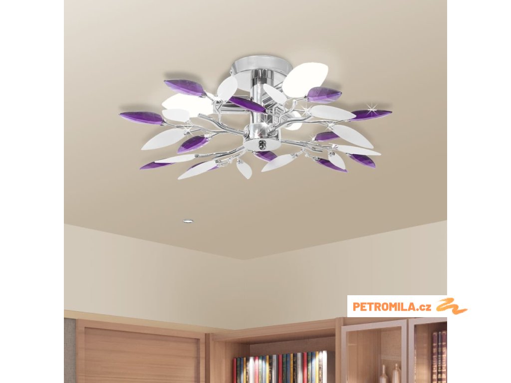 Stropní svítidlo, bílé a fialové křišťálové listy, na 3 žárovky E14