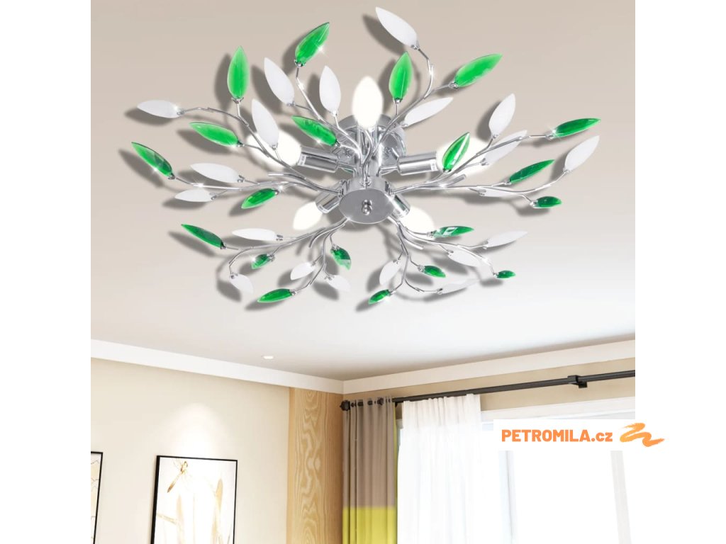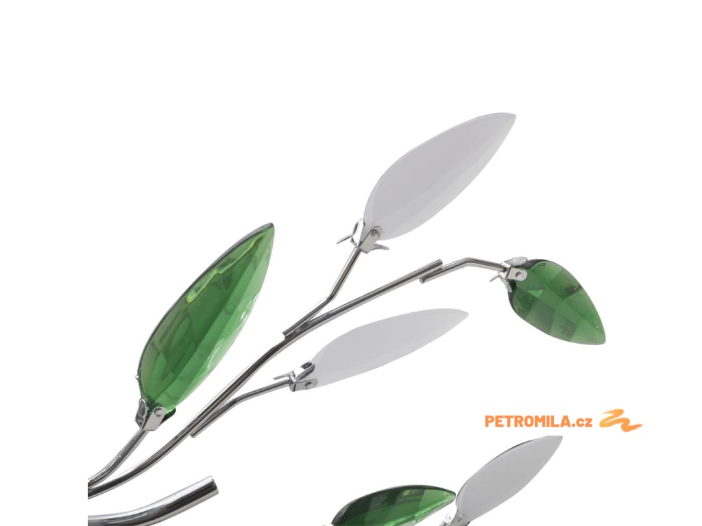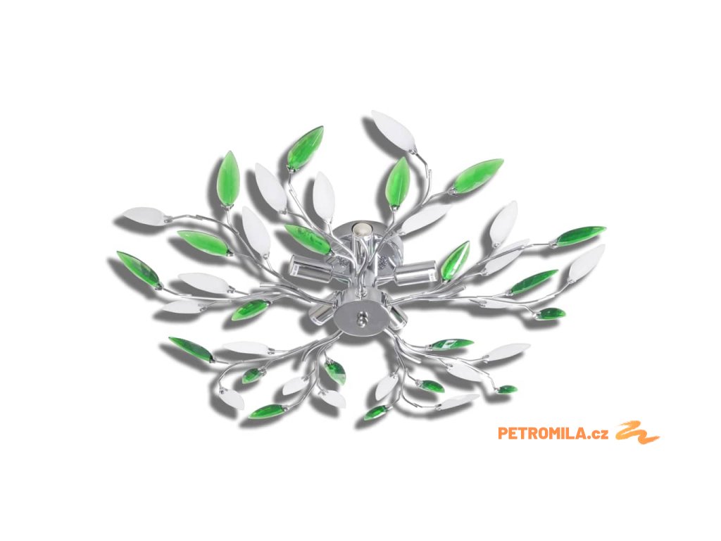 Stropní svítidlo, bílé a zelené křišťálové listy, na 5 žárovek E14