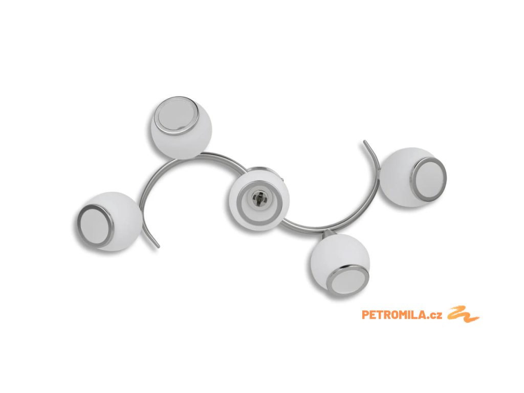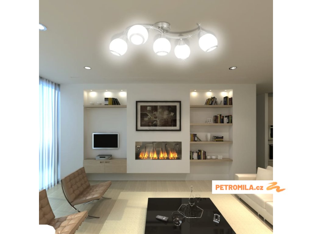 Toto jedinečné stropní svítidlo se pěti skleněnými stínidly se vyznačuje moderním designem. Povrchová úprava ze saténového niklu dodává teto lampě současný vzhled, což se perfektně hodí do každého moderního obývacího pokoje či ložnice.