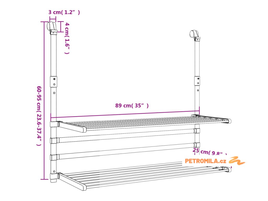 Sušák na prádlo na balkon 89 x 25 x (60–95) cm hliník