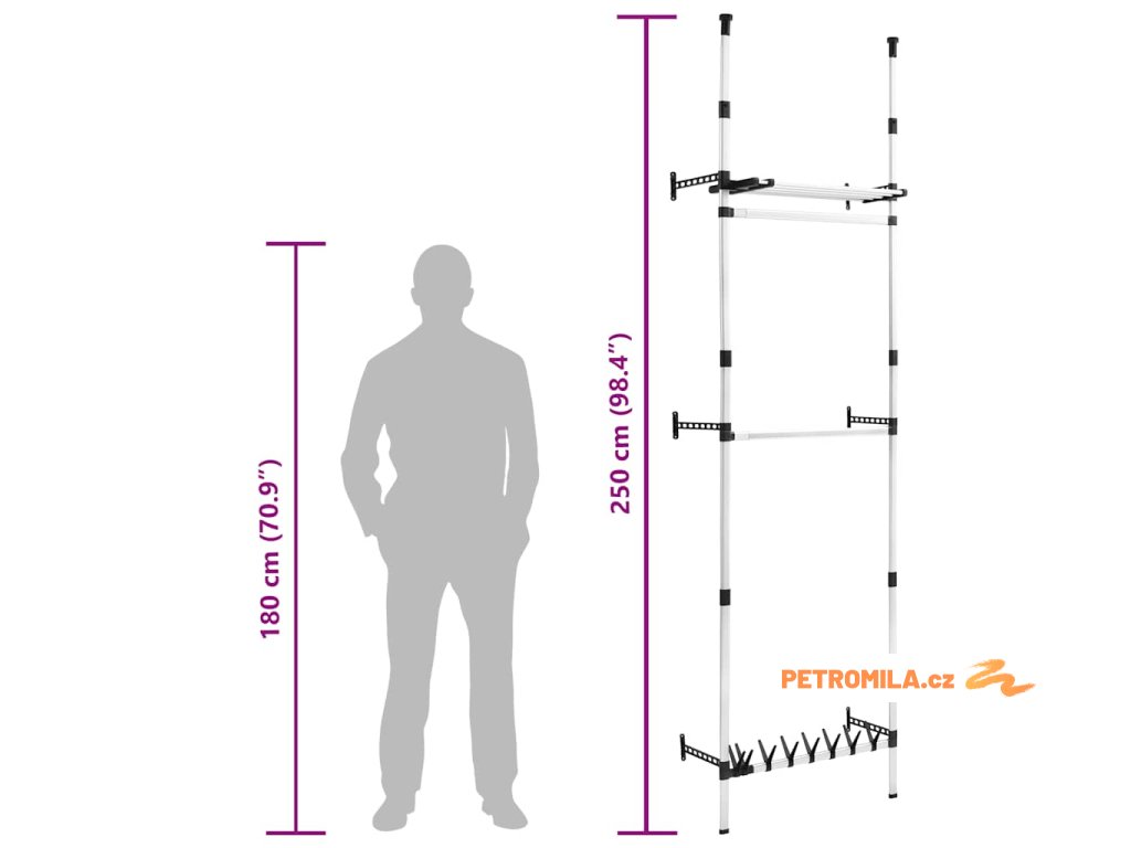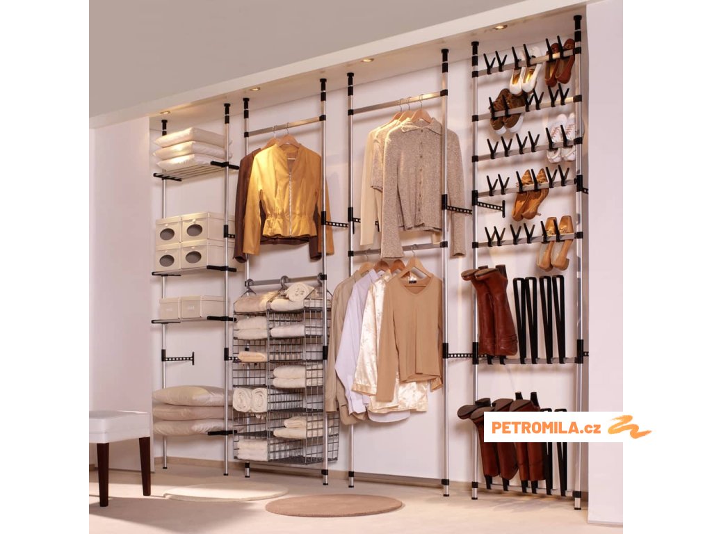 Teleskopický šatní systém je vyrobený z hliníku, takže je odolný a robustní. Tento úložný regál s teleskopickým systémem lze nastavit a přizpůsobit jeho výšku a šířku danému prostoru a vašim požadavkům. Nabízí jedinečný a důmyslný způsob uspořádání šatníku.