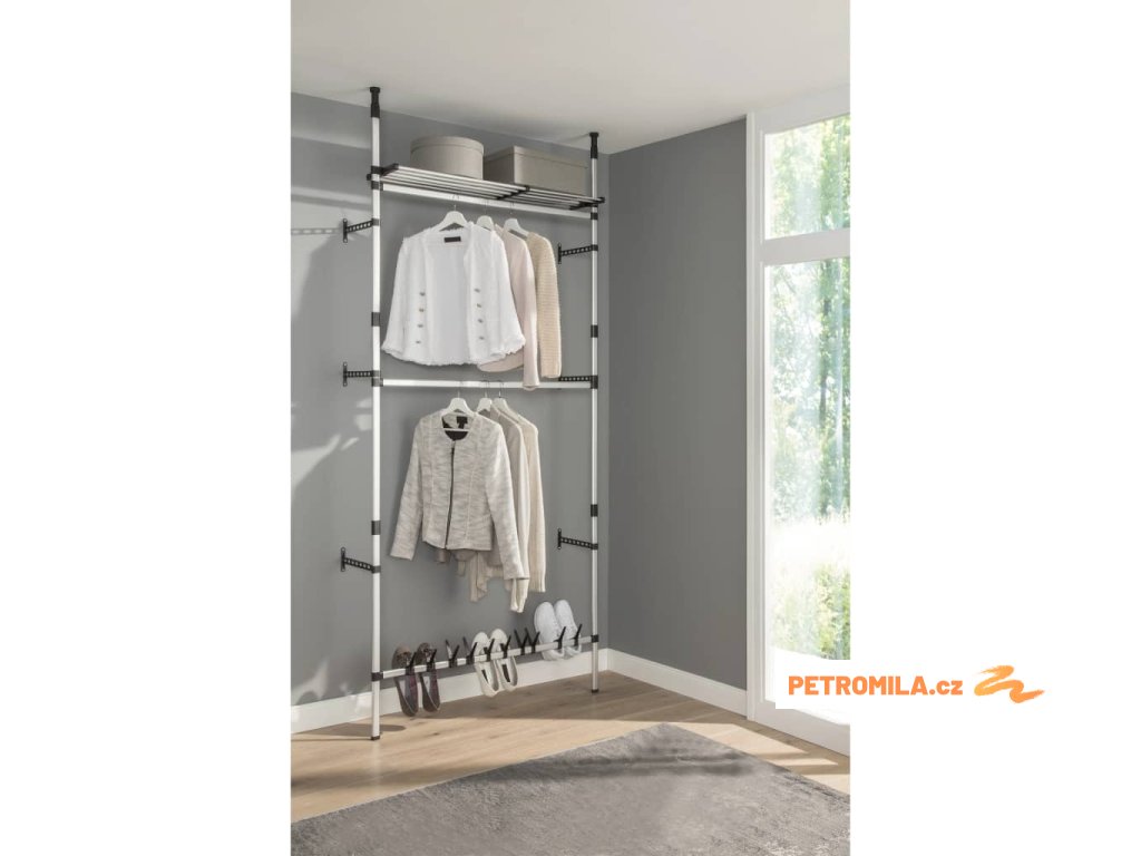 - 1 nastavitelná police, 2 horní tyče na oblečení a 1 spodní tyč na 8 párů bot