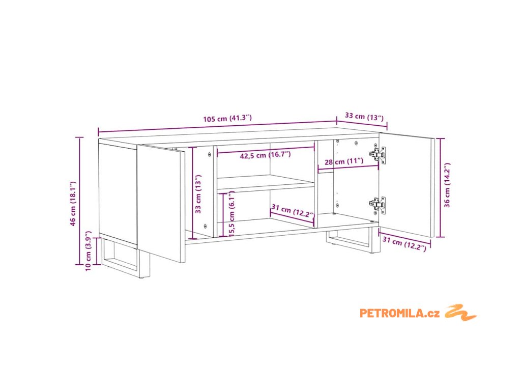 - Materiály: Vyrobený z masivního mangového dřeva a kompozitního dřeva, tenhle TV stolek má pevný design, který ukazuje jeho přirozenou krásu. Mangové dřevo má unikátní vzory, které dodávají rustikální kouzlo, a kompozitní dřevo zajišťuje jeho odolnost a spolehlivost na roky.