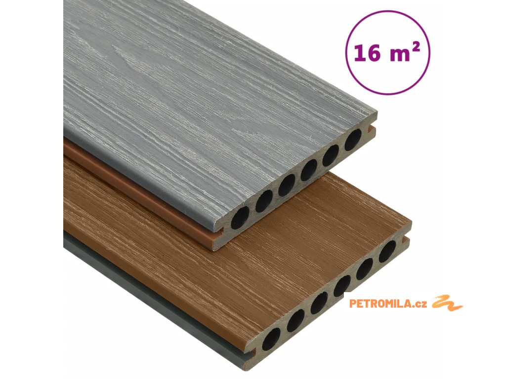 Terasová prkna jsou vyrobená z dřevoplastového kompozitu, skvěle vzdorují vodě a jsou vysoce odolná, takže vydrží i dlouhodobé používání. Vzhledem ke své mimořádné tloušťce 23 mm jsou nesmírně bytelná. Na rozdíl od běžných podlahových desek z WPC jsou tato dřevoplastová prkna koextrudovaná pro extrémní pevnost a odolnost. Jedná se o výrobní proces, při kterém je na vrchní část palubky nanesená další vrstva a posléze ražená, aby získala jedinečnou texturu dřeva s viditelnou kresbou. Každá strana desky má jinou barvu, jedna strana je hnědá a druhá šedá, takže si můžete vybrat finální barvu pokládky podle vašeho přání.