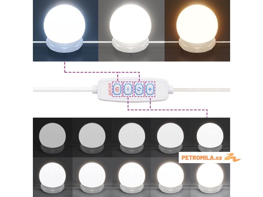 - LED světla: Kosmetický stolek má LED žárovky s USB, u kterých lze snadno přepínat režimy z teplé do studené bílé. Integrované LED žárovky kolem zrcadla zvýrazní i vaši krásu.