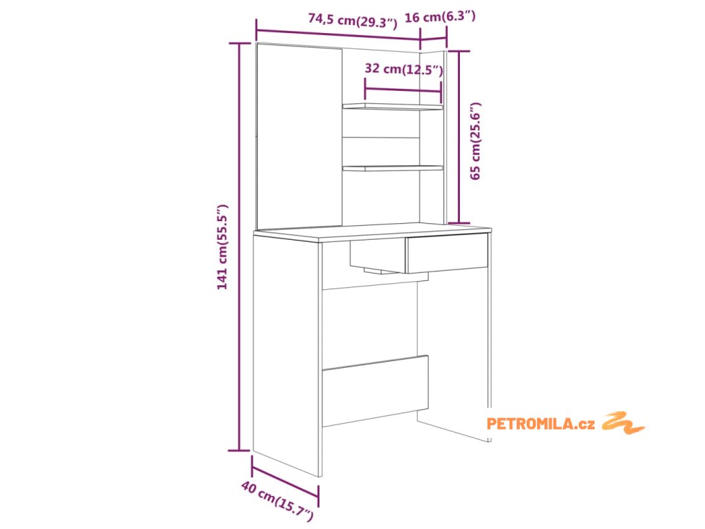 - Rozměry toaletního stolku: 74,5 x 40 x 141 cm (Š x H x V)