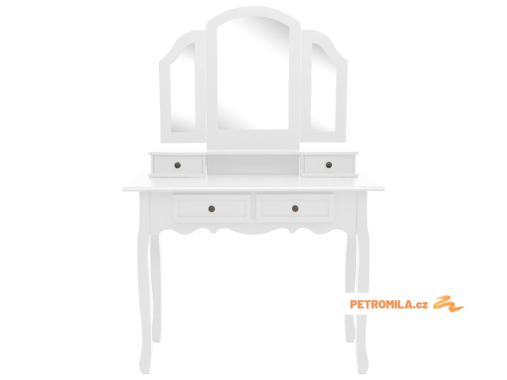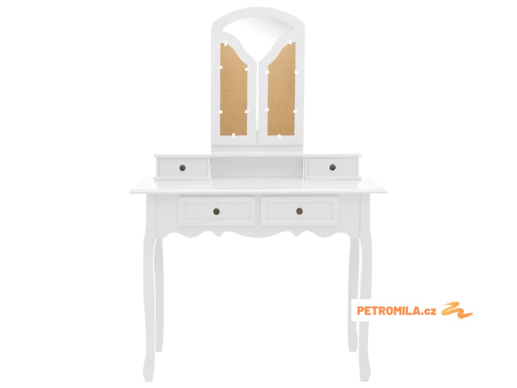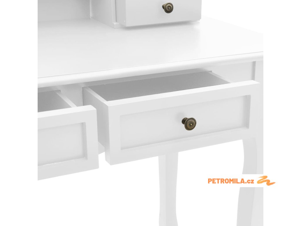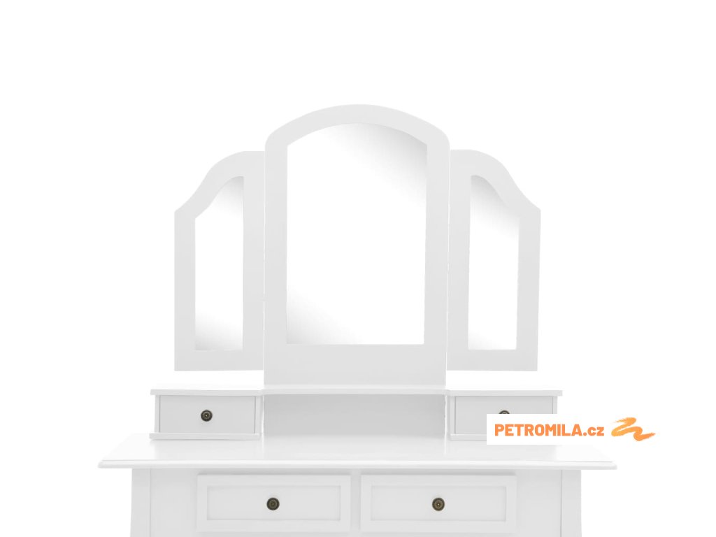 Toaletní stolek je opatřený zrcadlem 3 v 1. Po stranách hlavního zrcadla jsou umístěná dvě zrcadla, která jsou připevněná k hlavnímu zrcadlu odolnými panty. Proto je můžete natočit do požadovaného úhlu. Určitě vás mile překvapí, že zrcadlo a stolek můžete používat odděleně. Ve stolku jsou 4 chic zásuvky, které slouží jako další úložný prostor na vaše šperky, kosmetiku nebo vaše osobní věci. Ať už se rozhodnete umístit tento kosmetický stolek se stoličkou kamkoliv, jistě se stane středem pozornosti.