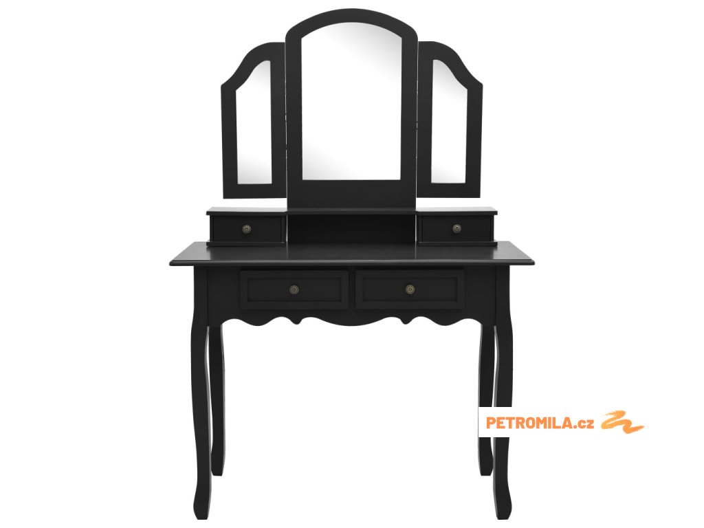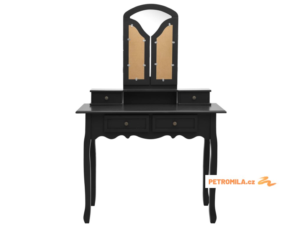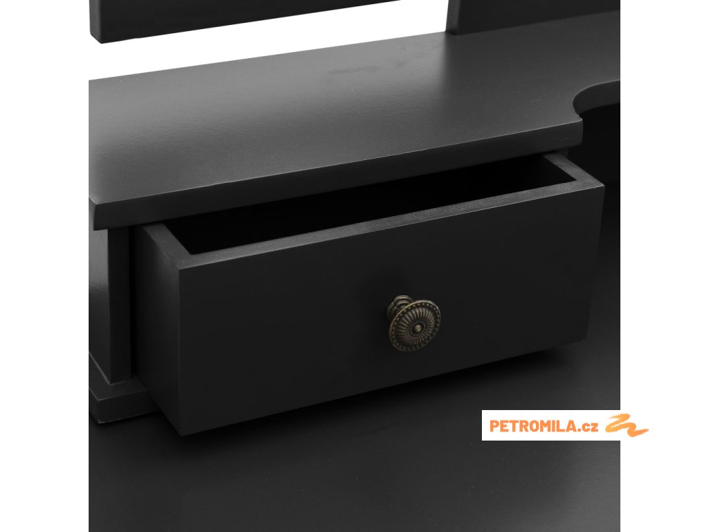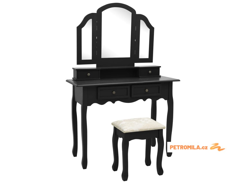 Toaletní stolek je opatřený zrcadlem 3 v 1. Po stranách hlavního zrcadla jsou umístěna dvě zrcadla, která jsou připevněná k hlavnímu zrcadlu odolnými panty. Proto je možné je natočit do vámi požadovaného úhlu. Určitě vás mile překvapí, že zrcadlo a stolek můžete používat odděleně. Ve stolku jsou 4 chic zásuvky, které slouží jako další úložný prostor na vaše šperky, kosmetiku nebo vaše osobní věci. Ať už se rozhodnete umístit tento kosmetický stolek se stoličkou kamkoliv, jistě se stane středem pozornosti.