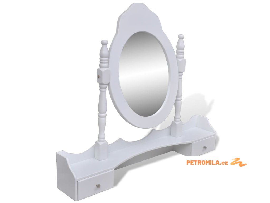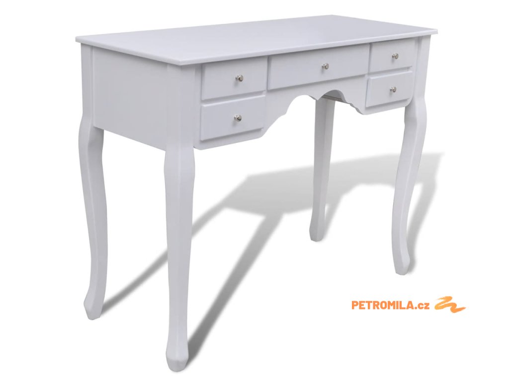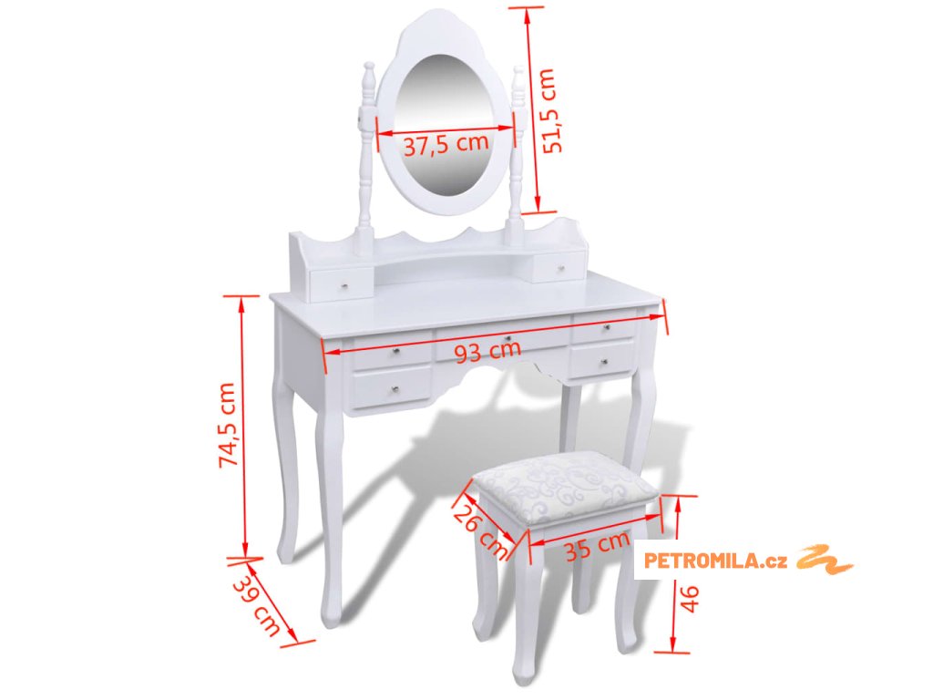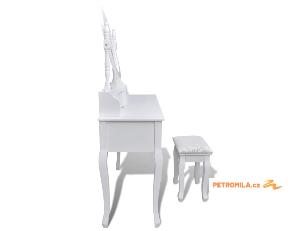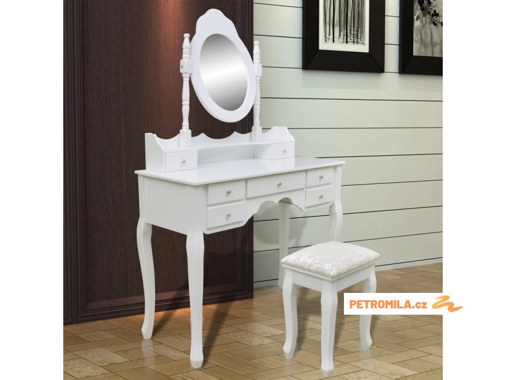 Zrcadlo stolku má volně stojící rám, takže ho budete moci natočit do požadovaného úhlu. Překvapí vás, že zrcadlo a stolek můžete používat samostatně. Sedm elegantních zásuvek vám poskytne místo navíc na vaše ozdoby, kosmetiku a další soukromé věci. Tento toaletní stolek se stoličkou bude vynikat kdekoliv, kam ho umístíte.
