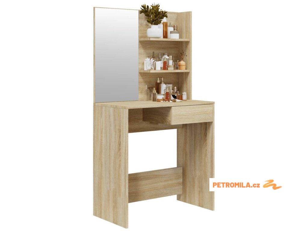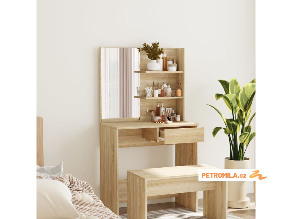 - Dostatek úložného prostoru: Stolní deska, police ve dvou patrech na stole a jedna zásuvka pod stolem poskytují dostatek prostoru pro snadný přístup k vašemu make-upu, šperkům a každodenním nezbytnostem.