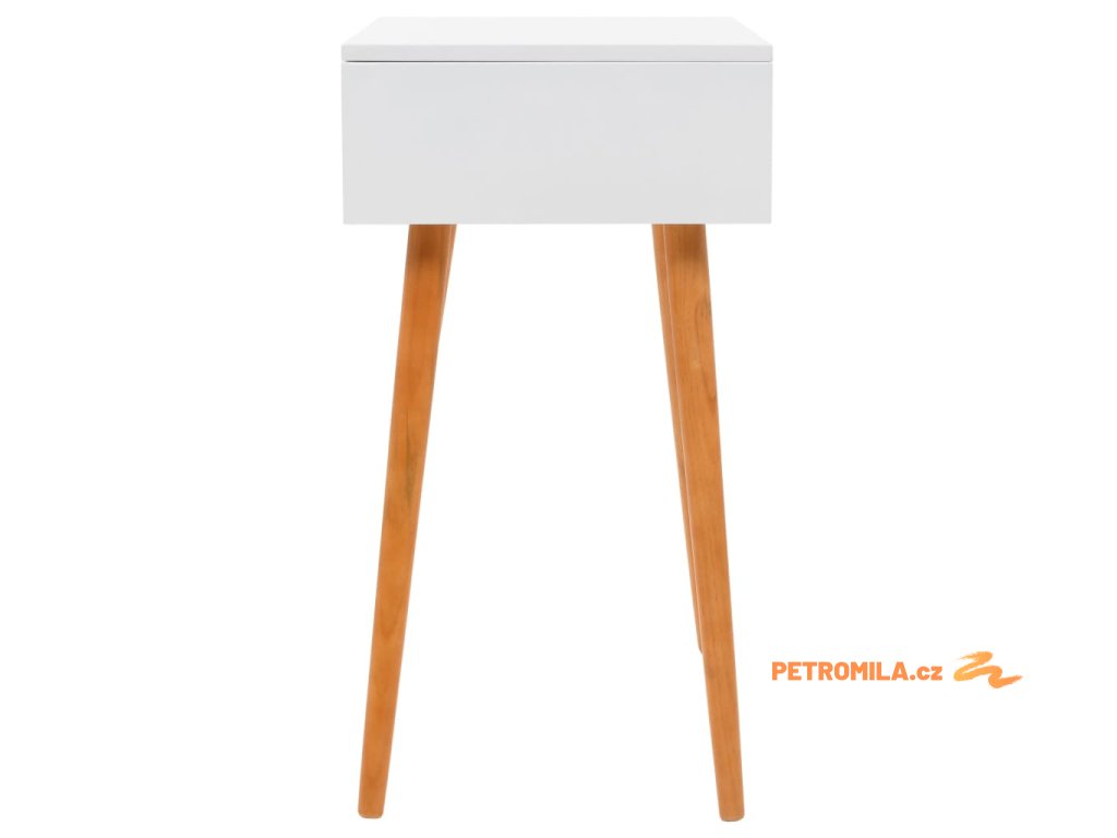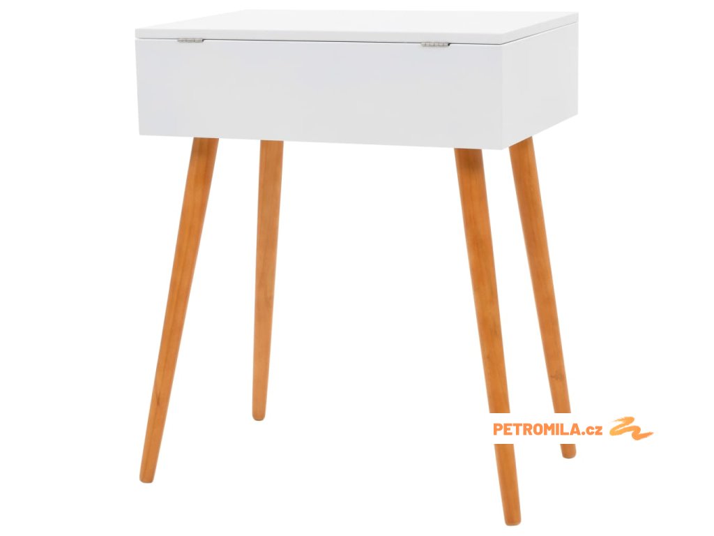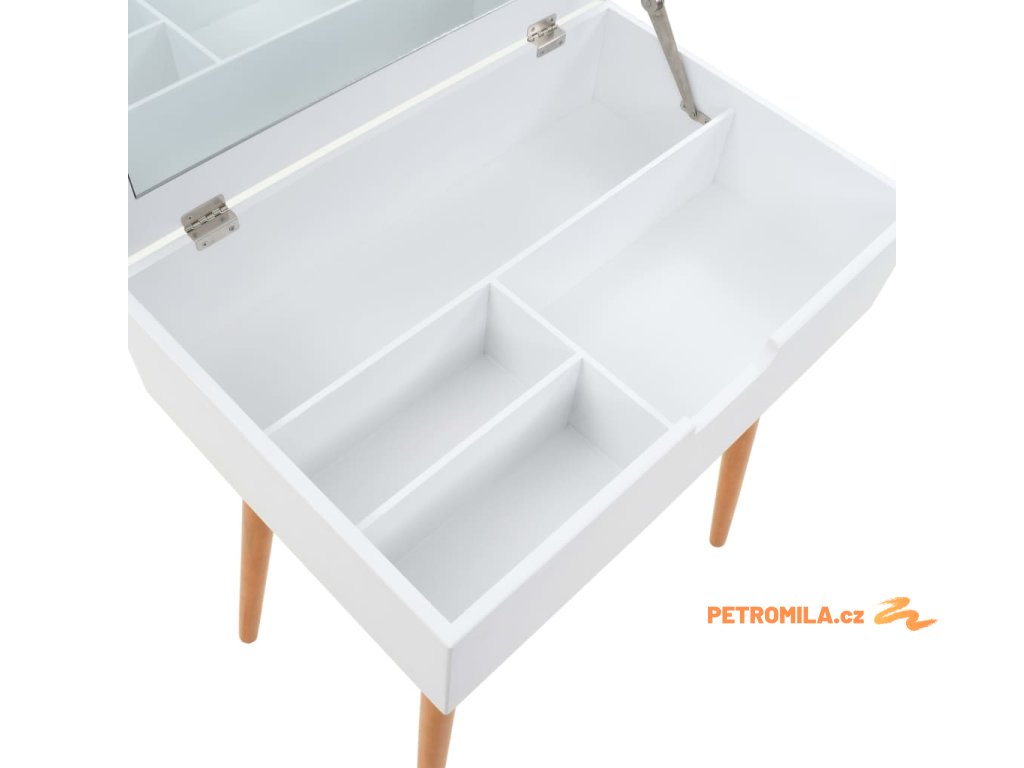 Stolek je vyroben z MDF a je vybaven skleněným zrcadlem. Zvednutím panelu odkryjete zrcadlo a prostorné přihrádky na šperky. Poskytne vám spoustu prostoru pro vaši kosmetiku, vlasové produkty a přípravky pro péči o pleť. Pokud zrcátko právě nepoužíváte, dá se stolní deska výborně využít k odkládání nejrůznějších líčidel, šperků a kosmetických potřeb. Pevné dřevěné nohy zajišťují stabilitu stolku a zároveň přispívají k jeho modernímu stylu z poloviny století.