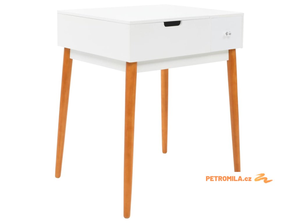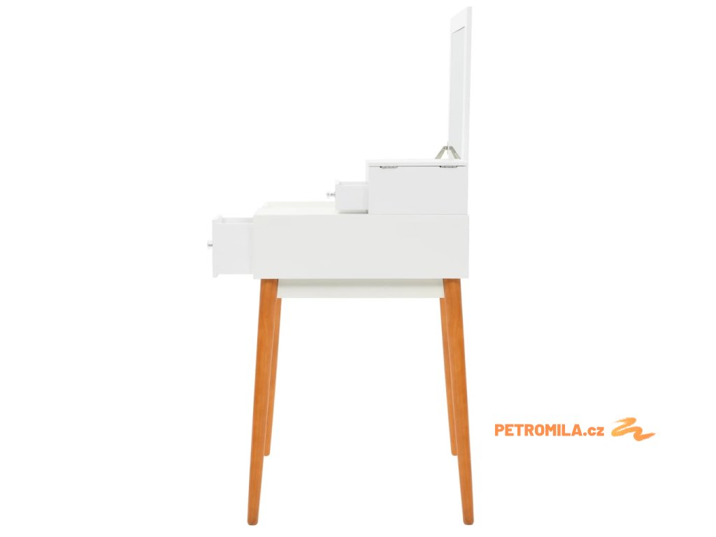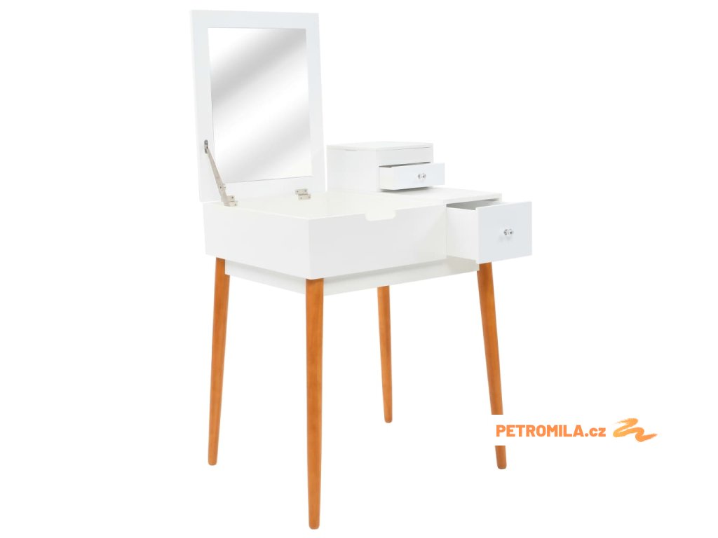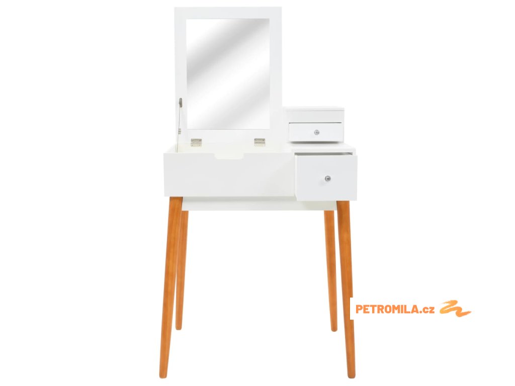 Stolek je vyroben z MDF a je vybaven skleněným zrcadlem. Levý panel je možné zvednout, čímž odkryjete zrcadlo a prostorné přihrádky na šperky. Poskytne vám spoustu prostoru pro vaši kosmetiku, vlasové produkty a přípravky pro péči o pleť. Pokud zrcátko právě nepoužíváte, stolní deska lze výborně využít k odkládání nejrůznějších líčidel, šperků a kosmetických potřeb. Pevné dřevěné nohy zajišťují stabilitu stolku a zároveň přispívají k jeho modernímu stylu z poloviny století.