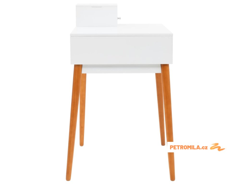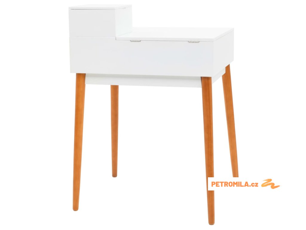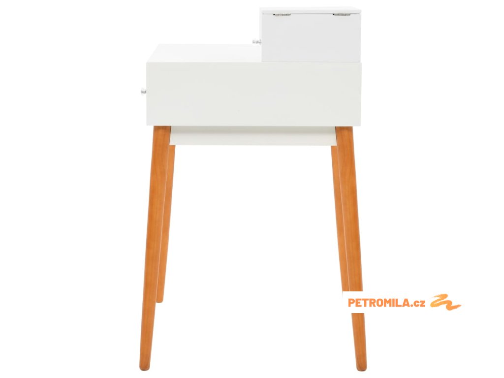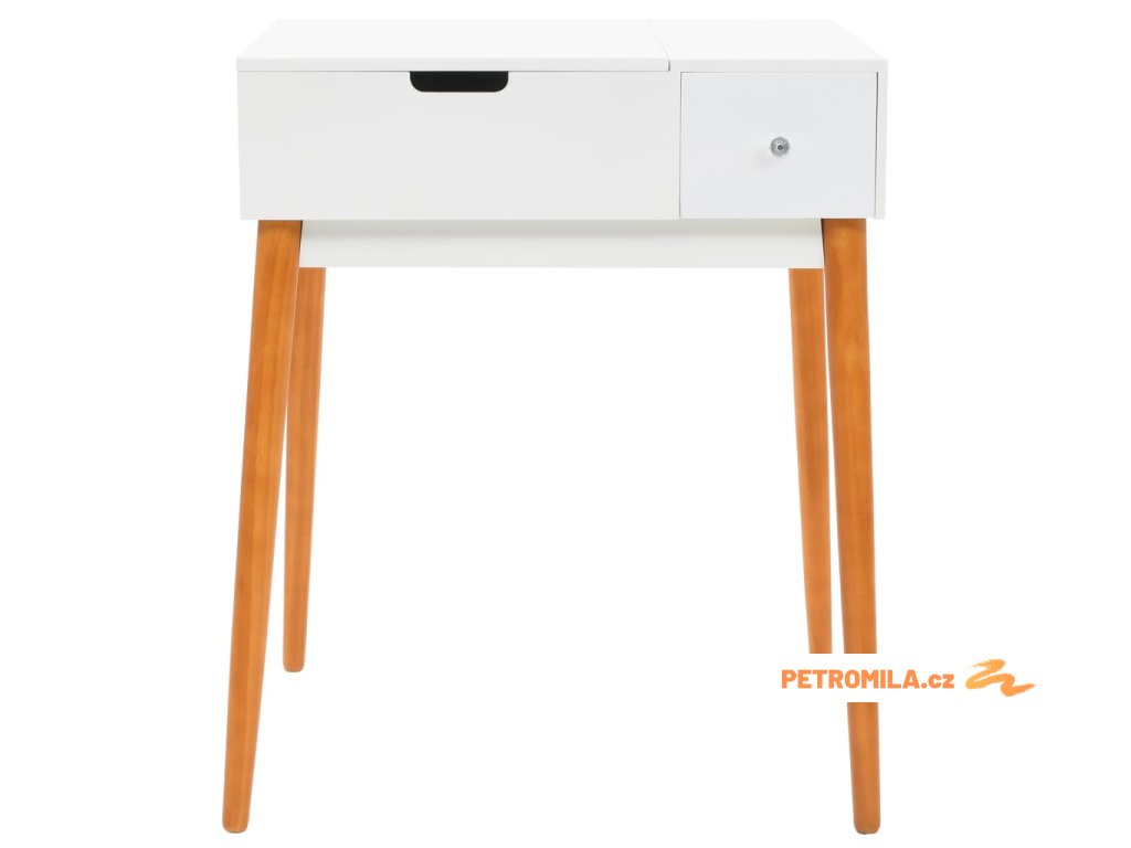 Stolek je vyroben z MDF a je vybaven skleněným zrcadlem. Levý panel je možné zvednout, čímž odkryjete zrcadlo a prostorné přihrádky na šperky. Poskytne vám spoustu prostoru pro vaši kosmetiku, vlasové produkty a přípravky pro péči o pleť. Pokud zrcátko právě nepoužíváte, stolní deska lze výborně využít k odkládání nejrůznějších líčidel, šperků a kosmetických potřeb. Pevné dřevěné nohy zajišťují stabilitu stolku a zároveň přispívají k jeho modernímu stylu z poloviny století.
