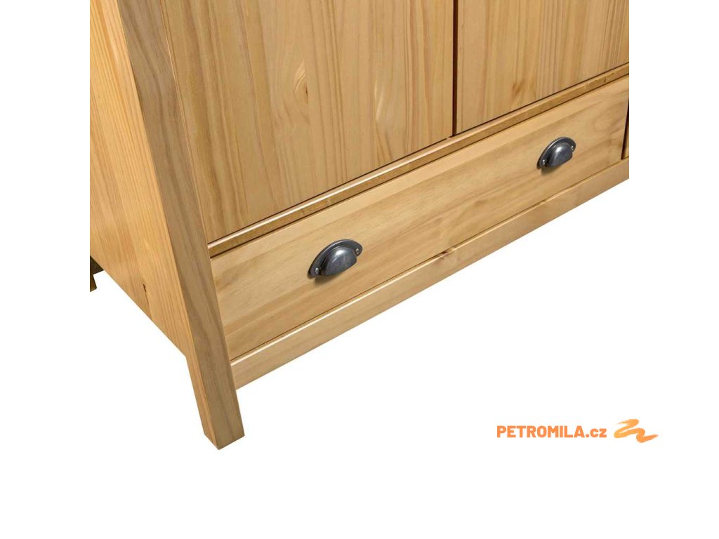 Šatní skříň je zhotovena z masivního borového dřeva, je tedy velmi robustní. Šatní skříň se 2 zásuvkami a 5 policemi poskytuje dostatek prostoru pro přehledné uložení menších věcí na dosah ruky. Velká přihrádka je vybavena šatní tyčí, kterou můžete použít k zavěšení kabátů, šatů atd. Šatní skříň se snadno sestavuje.