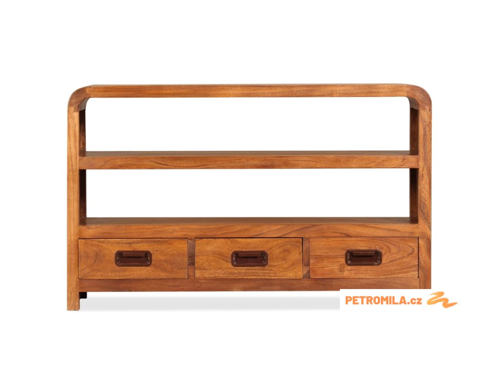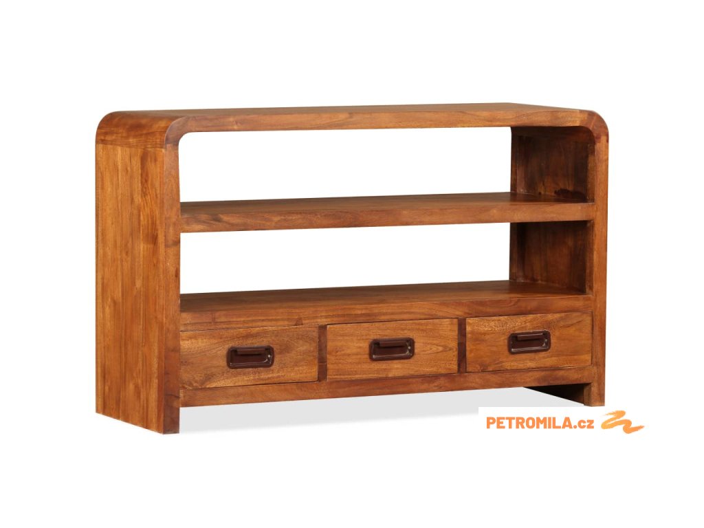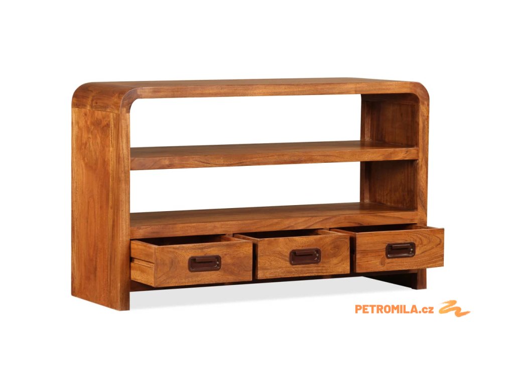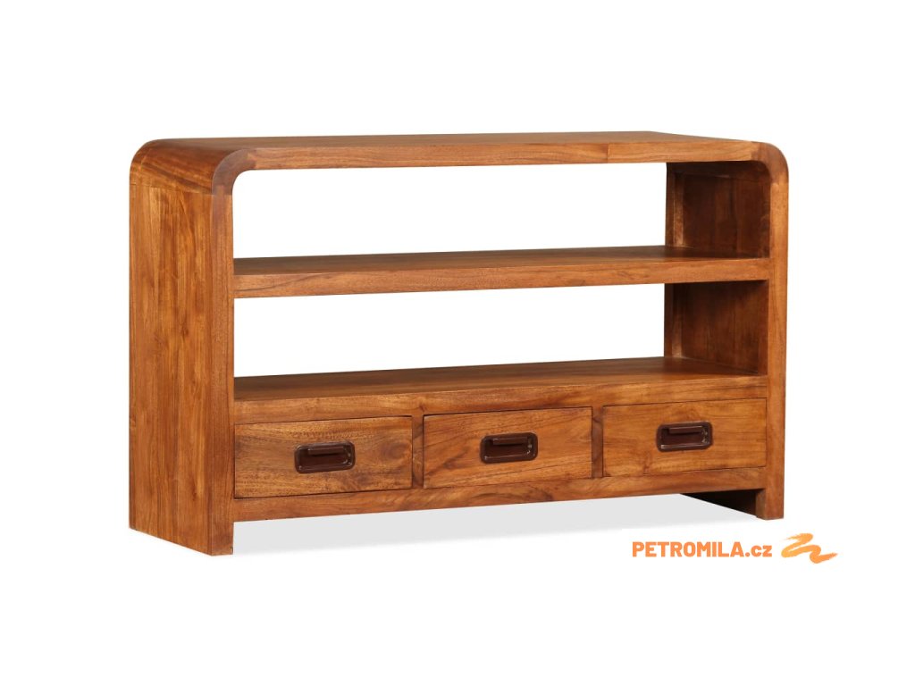 Tato skříňka na multimediální zařízení je zhotovená z masivního akáciového dřeva. Akácie je odolné tropické tvrdé dřevo. Tato skříňka pod televizi je celá ručně vyrobená a překrásná kresba dřeva propůjčuje každému kusu jedinečný a od ostatních lehce odlišný charakter. Je vybavená 2 policemi a 3 zásuvkami, na které se vejde všechno vaše multimediální vybavení, nosiče médií a ostatní předměty, které si chcete vystavit či schovat někde po ruce. Tento výrobek je dodávaný ve složeném stavu, montáž není nutná.
