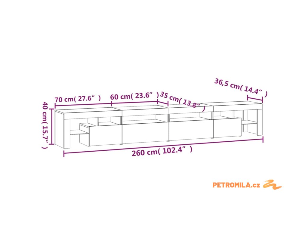- Celkové rozměry: 260 x 36,5 x 40 cm (D x Š x V)
