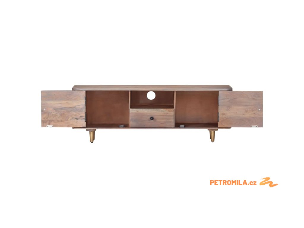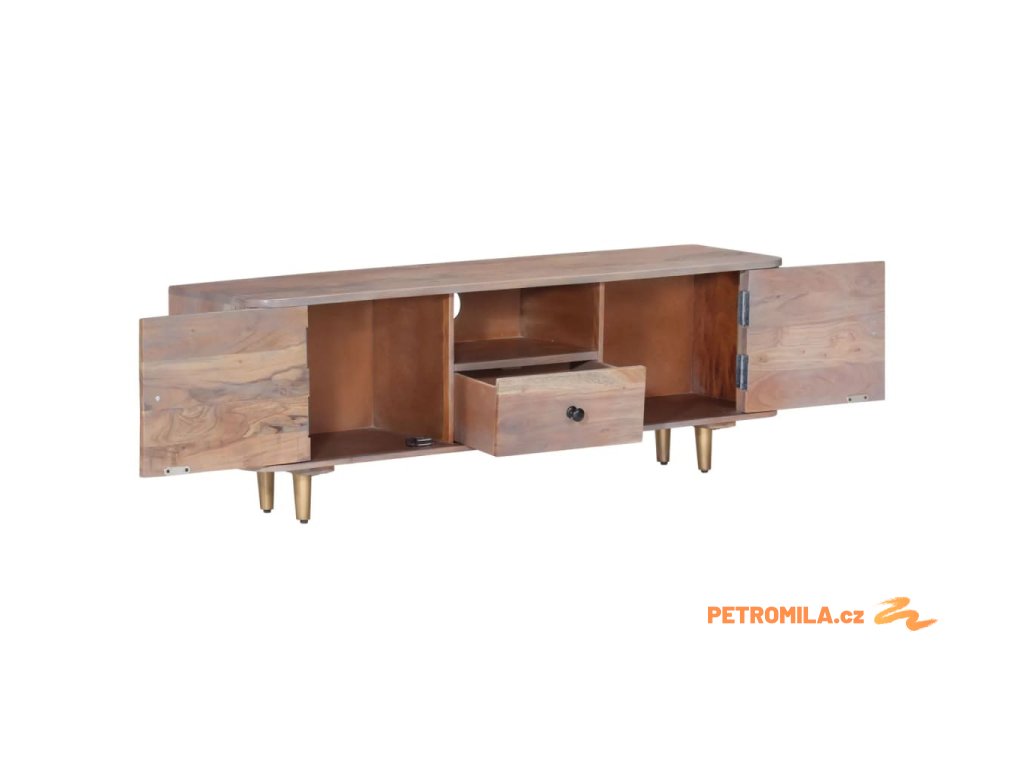TV stolek je vyrobený z masivního akáciového dřeva, tvrdého dřeva s hustou kresbou, je tedy stabilní a odolný. Železné nohy zaručují mimořádnou stabilitu a robustní horní část lze použít k vystavení dekorativních předmětů. Úložná přihrádka a zásuvky nabízí dostatek místa pro ukládání vašich multimediálních zařízení, knih a celé řady dalších věcí.