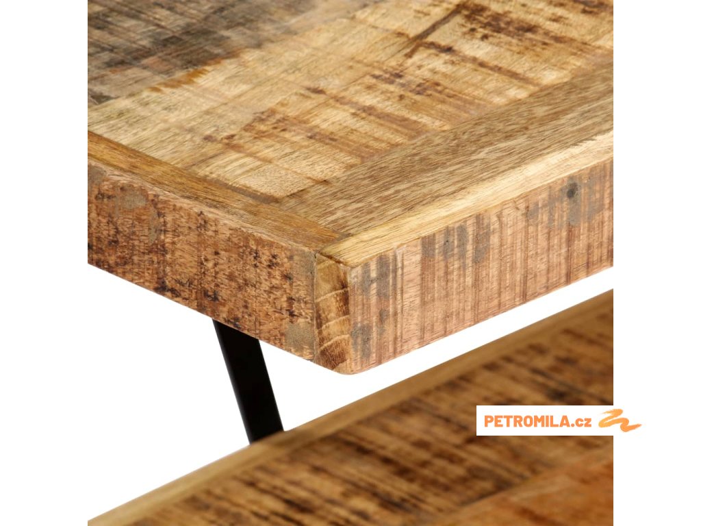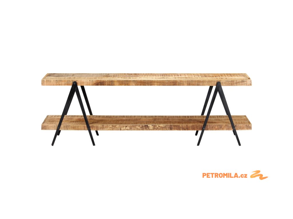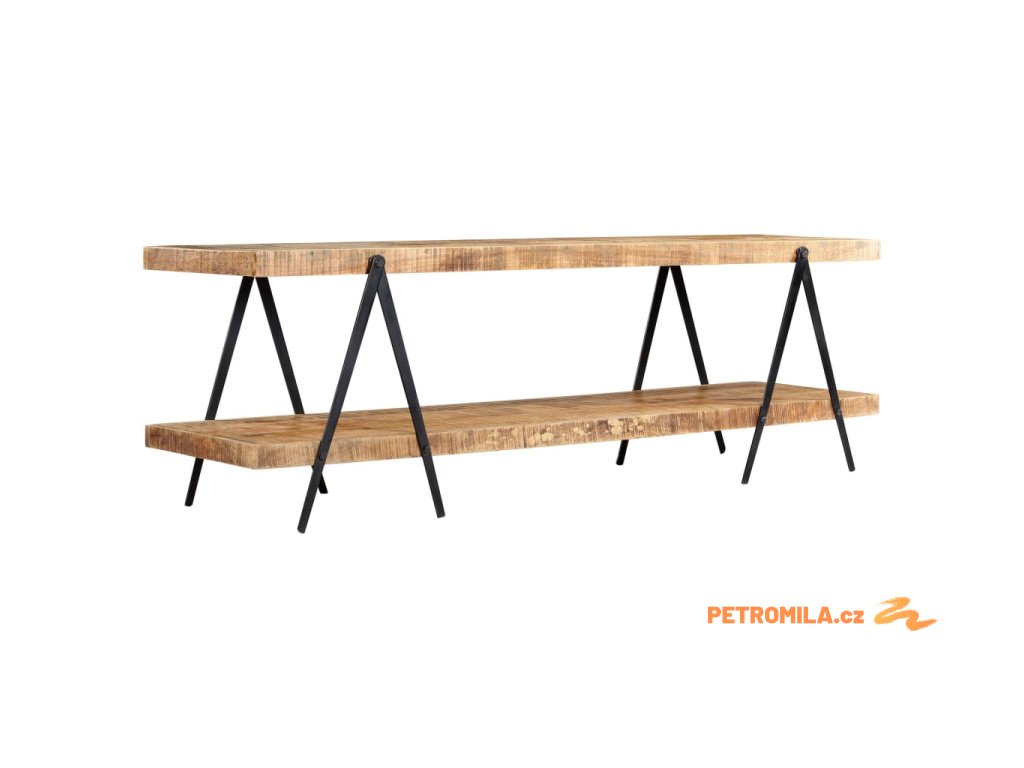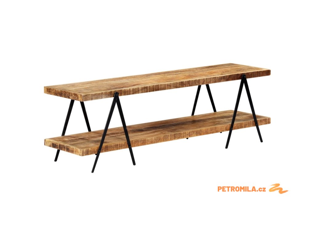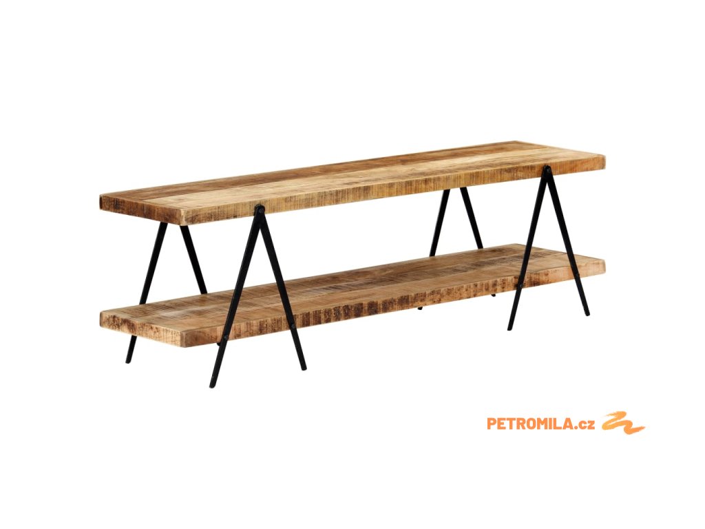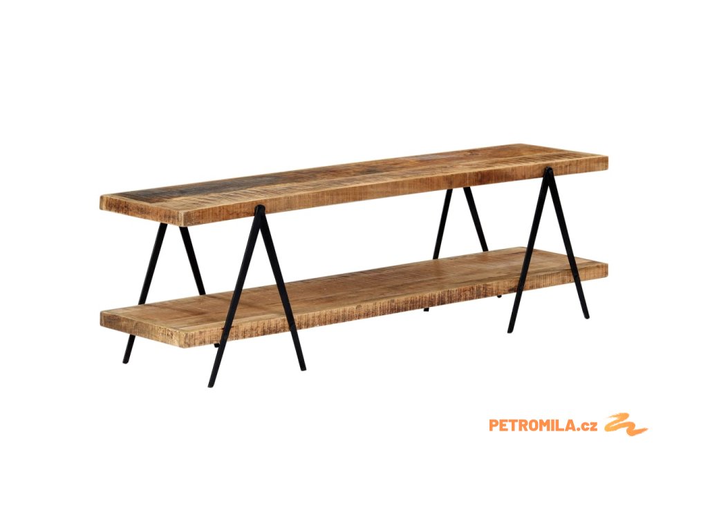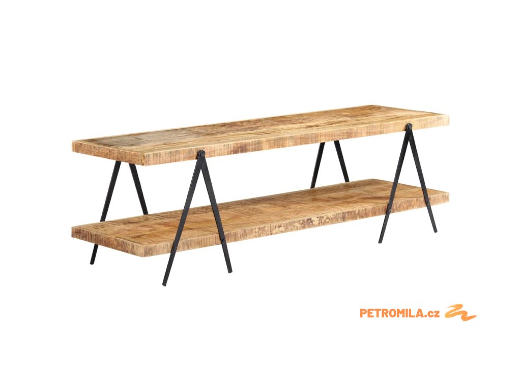 TV stolek je vyroben z masivního mangovníku, tvrdého dřeva s hustou texturou. Hrubé mangovníkové dřevo je nejen schopné unést značnou váhu, ale výborně také odolává opotřebení a působení času. Odkládací skříňka s překrásným designem je proto stabilní, odolná a příjemná na pohled. Precizní řemeslné zpracování a unikátní kresba dřeva dávají vzniknout jedinečným kusům nábytku, které se lehce liší od všech ostatních. Každé fázi výrobního procesu byla věnována mimořádná péče, ať už se jedná o leštění anebo lakování. Televizní stolek má 2 prostorné police, kam si můžete uložit svá multimediální zařízení, knížky a všelijaké další věci. Rám s práškovým lakováním přispívá k pevnosti konstrukce a zdůrazňuje také industriální šarm nábytku. Sestavení tohoto produktu je snadné.