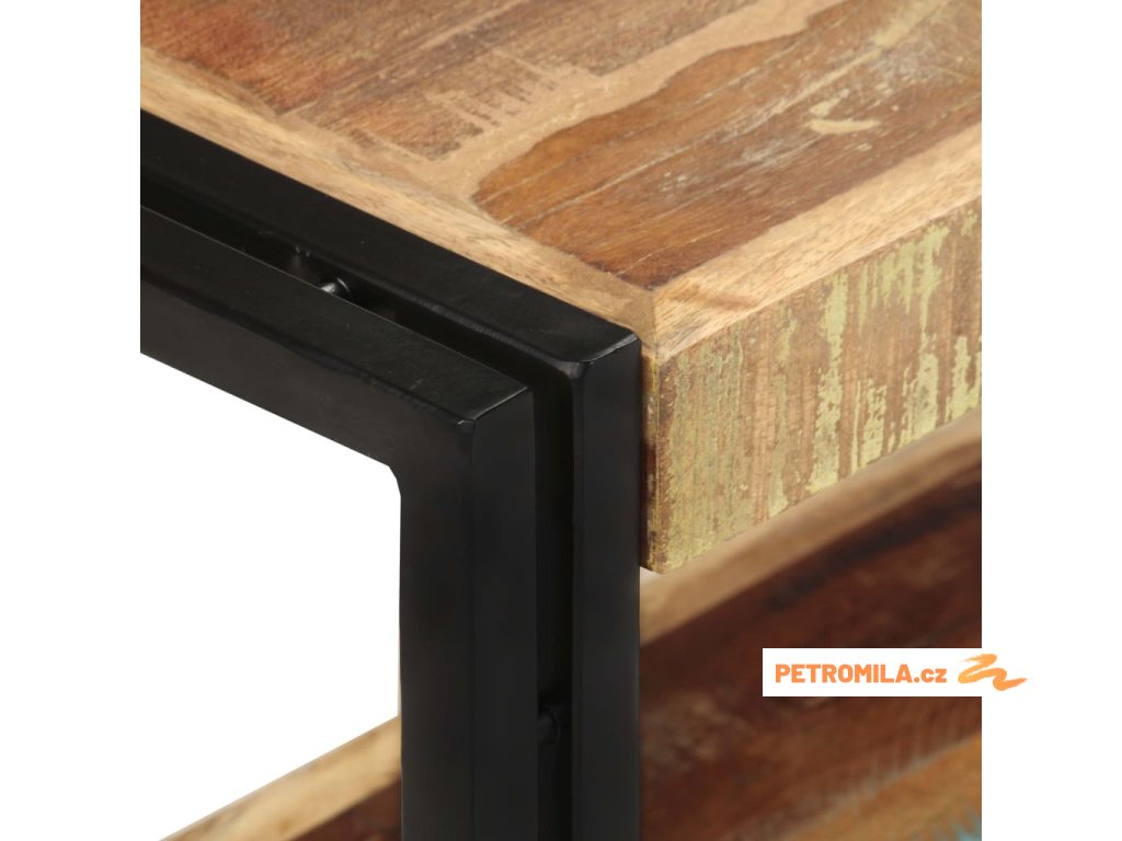HiFi skříňka je vyrobená z masivního recyklovaného dřeva, které pochází z trámů, podlah a podpěrných nosníků starých budov určených k demolici. Sestává tedy z různých druhů dřeva, jako je teak, tvrdé dřevo, tropické dřevo, mangovník apod. Recyklované dřevo tak nabývá vlastností všech těchto rozličných typů dřevin. Navíc je již zestárlé, ošlehané a vyschlé, takže se nesmršťuje ani neohýbá. Práškově lakované železné nohy přispívají jednak k bytelnosti příborníku a jednak zdůrazňují jeho industriální styl. V příborníku je prostorná police, kde najdete dostatek místa pro vaše multimédia, knihy a celou řadu dalších věcí.