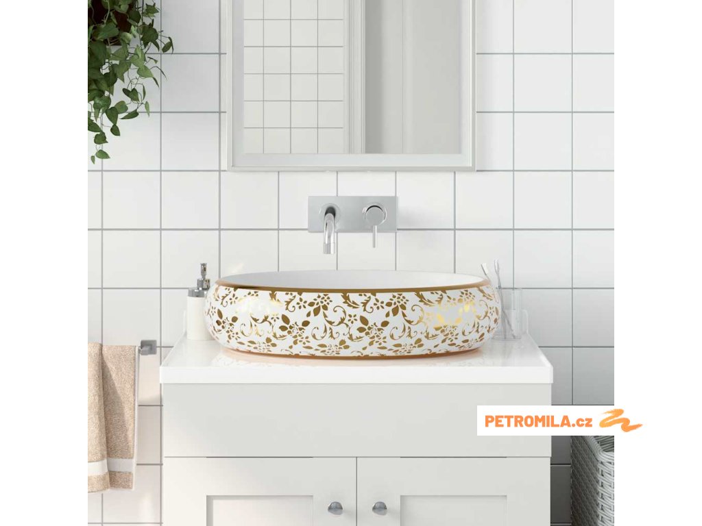 Umyvadlo na desku bílé a zlaté oválné 59 x 40 x 15 cm keramika